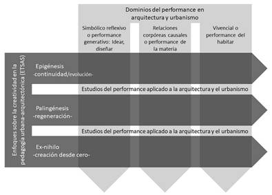 Estos dominios, basculan entre las prácticas más apegadas al conocimiento (la cognición) y otras a la invención (la creación). Es decir, en lo que va de la tradición a la innovación, pasando por la transformación, estos dominios permiten el diálogo con las experiencias de la enseñanza-aprendizaje de la arquitectura, con base en la convocatoria del Congreso internacional “La paradoja organicista de la enseñanza de la arquitectura. Enseñar como epigénesiss, palingénsesis o ex-nihilo"[1], sobre términos análogos de la biología: que se refieren a la continuidad y evolución de una estructura simple a una compleja (epigénesis) y a la regeneración, renacimiento o volver a crear algo existente (palingénesis); y de la filosofía y teología para explicar la creación a partir de nada, o algo que se identifique como contrahegemónico (ex-nihilo). Esta perspectiva se alinea de manera sinérgica con las formas de cognición y creatividad en la pedagogía arquitectónica y urbana: desde la epigénesis, aprovecha la memoria y la experiencia acumulada para adaptar y reinterpretar lo existente, en donde, cómo ya se dijo, cabe la tendencia predominante de reproducción de modelos foráneos exitosos; la palingénesis, donde la práctica del performance permitiría regenerar y actualizar el sentido de los espacios sobre una base de observación crítica de intra-acciones para la resignificación de los elementos que las conforman; y lo ex-nihilo, que fomenta la creación radical y la experimentación a partir de la performance de las entidades que cualquier individuo o grupo toma como existentes en el mundo real. De esta manera, un enfoque performativo en la enseñanza en arquitectura y urbanismo propendería un aprendizaje activo y experiencial donde la memoria de la actividad —el registro y análisis de las acciones, intra-acciones y reflexiones de los estudiantes— se convierte en un recurso fundamental para la innovación pedagógica. Cabe aclarar que la performance pedagógica también puede integrar otras formas de existencia, como las vividas a través de las tecnologías digitales —apps, realidad aumentada o simuladores— para potenciar el aprendizaje que forma arquitectos capaces de actuar, reflexionar y transformar el entorno desde la experiencia vivida y la memoria colectiva de sus propias prácticas. En la Fig. 1, resumimos cómo se formula este diálogo entre la producción del performance desde los dominios, con estas tres aproximaciones pedagógicas propuestas por el evento mencionado, entre el “pensar” —conocimiento y base teórica— y el “hacer” —capacidad de aplicar conocimientos prácticos—, a las cuales sumamos las del “ser” —formación ética, social y humana— que completa la tríada pedagógica de la Facultad de Arquitectura y Diseño (FAD) de la Pontificia Universidad Javeriana.