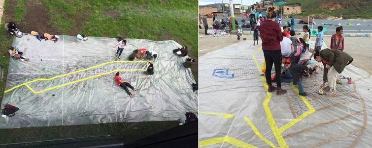 Como experiencia docente en la PUJ relacionadas con este dominio se puede mencionar las del Proyecto Ubicar en 2015, en la cual los estudiantes desarrollaron actividades performativas con la comunidad de Altos de la Florida en Soacha (Bogotá) y Vallecito en el Magdalena Medio colombiano. Estos lugares caracterizan dos espacios en relación conflictiva: uno urbano receptor de población, frente a uno rural expulsor, por las condiciones de violencia que vivió el país durante la primera década de este siglo. Por tanto, se trata de exponentes típicos de segregación, marginalidad y vulnerabilidad social derivados del conflicto interno colombiano. La experiencia de docencia quedó consignada en el libro Arquitecturas Insurgentes (Montenegro, 2018) en donde refiere como los estudiantes aplicaron técnicas del performance para conseguir espacios de convivencia entre estudiantes y comunidad, con el fin de conocer y diagnosticar la situación socio-espacial en áreas autoconstruidas y vulnerables. La estrategia performativa inicialmente estuvo orientada a convocar a la comunidad para conseguir una comunicación basada en experiencias compartidas que propiciaran confianza y empatía. Para ello se dibujó el plano del asentamiento sobre un plástico de 6 × 12 metros (figura 7), que es la medida de la mayoría de los lotes en Altos de la Florida. A partir de esta referencia, el estudiante podía establecer relación experiencial entre las dimensiones del espacio y su capacidad para contener determinada cantidad de personas, según las actividades que realizaran en él. Posteriormente, esto sirvió para definir estándares espaciales en el proyecto.
