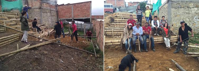 De este proceso resultaron siete proyectos: dos equipamientos comunitarios en el sector, una huerta-parque, un salón múltiple, dos versiones diferentes de salón comunitario y espacio público de borde en el mismo sector. Entre ellos se escogió uno solo para definir la germinación del proyecto, con el objetivo principal de vincularlo al grupo social que se encargará de las siguientes fases de ejecución y mantenimiento. El performance planteó adelantar alguno de los espacios, con el fin de que la comunidad lo asuma desde sus necesidades concretas de uso, lo cual, a su vez, impulsa el interés para materializarlo. La idea de germinación de proyecto está fundada en el sentido de progresividad que la comunidad viene utilizando en las construcciones de vivienda, pero aplicada de manera colectiva. El trabajo con los estudiantes permite que estos expliquen in situ las intenciones del espacio diseñado por ellos, los indicativos para el replanteo y los requerimientos técnicos para cada fase. En ese momento, es posible que se efectúen ajustes en los espacios a partir de imprevistos. Para esta acción de germinación, los estudiantes utilizaron los residuos de materiales que quedaron del ejercicio “Laboratorio Espacial y Material” de la Javeriana. La acción se desarrolló durante tres días, en los que participaron siete estudiantes y, al menos, cinco representantes permanentes de la comunidad, junto a un grupo adicional que participó de manera intermitente. A partir de la estrategia de acción planeada por los estudiantes, se logró moldear la pendiente del terreno, con el fin de conseguir una gradería que, a futuro, se convertirá en un auditorio para reuniones y espectáculos. Para el escalonamiento se utilizó un sistema básico de contención con estacas de madera y medias cañas de bambú (Fig. 9).