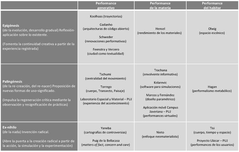 This article reviews the postulates of performance applied to design of architecture and urban planning, to contribute to the construction of alternative knowledge to the representationalist tradition in which these disciplines have developed and its possible use in teaching. The concern arises from Karen Barad's questions: how have questions of ‘fact’ been replaced by questions of meaning, and how did language become more reliable than matter? Through a review of authors who have approached these questions, three categories are studied to discuss new contributions in the materialisation of bodies, which, in the specific case of Latin America, produce hybrid experiences between hegemonic knowledge and spontaneous actions to conceive space from other logics. The intersection of these practices with approaches to teaching and the practice of architecture from epigenesis, palingenesis or ex-nihilo, allows us to propose alternatives to dominant representationalism.