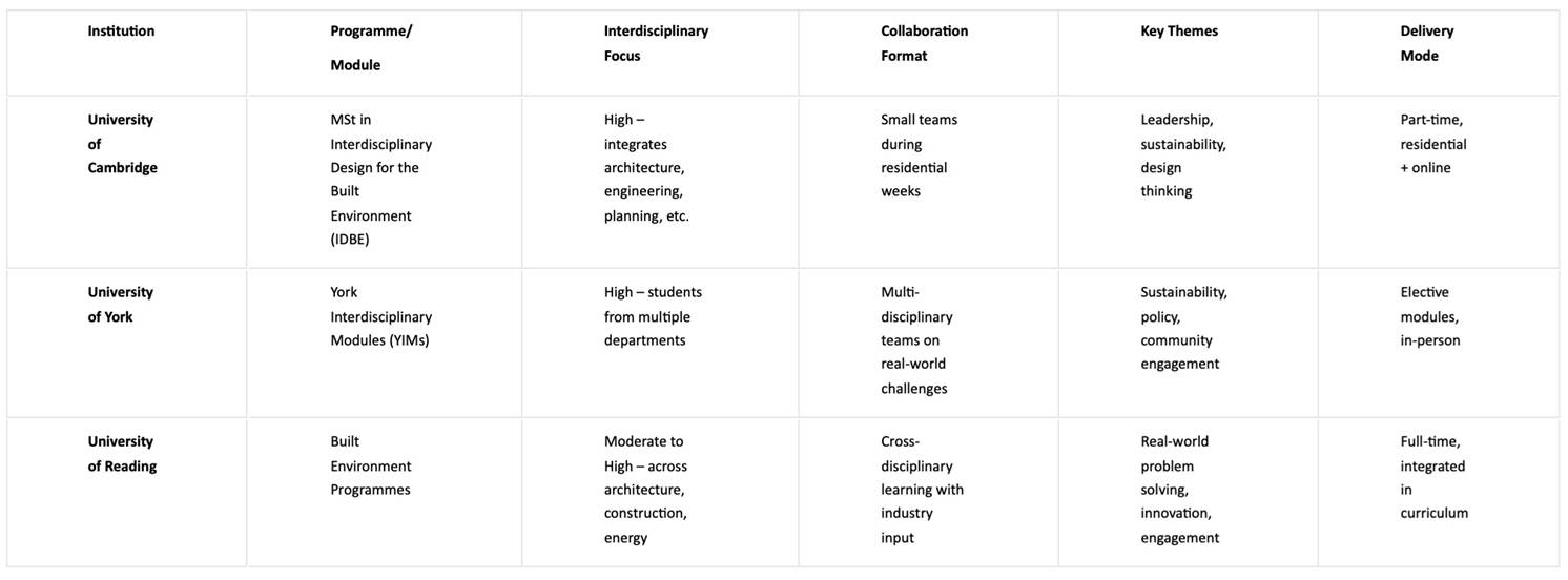 Some built environment schools in higher education are responding to the challenge and are offering interdisciplinary modules. These can be found at University of Cambridge, University of Reading and University of York and their qualities are summarised in Table 2. These provide team-based learning (Cambridge), industry collaboration (Reading), and community engagement (York) and exemplify the benefits of skills development in integrating collaboration, sustainability literacy and interdisciplinary thinking. What is notable about these is the postgraduate focus and in the case of University of York the modules are taken as electives.