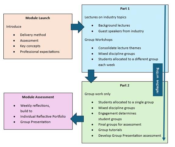 The Weekly Reflective Logs inform the Individual Reflective Portfolio. The Portfolio contains three parts, including a reflective statement, an appendix with four Weekly Reflective Logs and associated Workshop worksheets, and a list of references. The reflective statement requires reflection on two aspects of the module, including academic learning and approach to collaborative working. The practice of reflective writing over the semester builds confidence in preparing this statement. Students are expected to review their Logs to identify two themes upon which to reflect their learning. They could reflect on prior learning and consider this against what they learned from the lectures, both the background and guest speakers. In addition, they are expected to reflect on the group work across the semester and how discipline-specific knowledge informed that work. They should consider how their approach to group work changed over the semester. They should pull these strands together to identify their discipline role, how it interacts with other disciplines, and where their place in the industry sits.