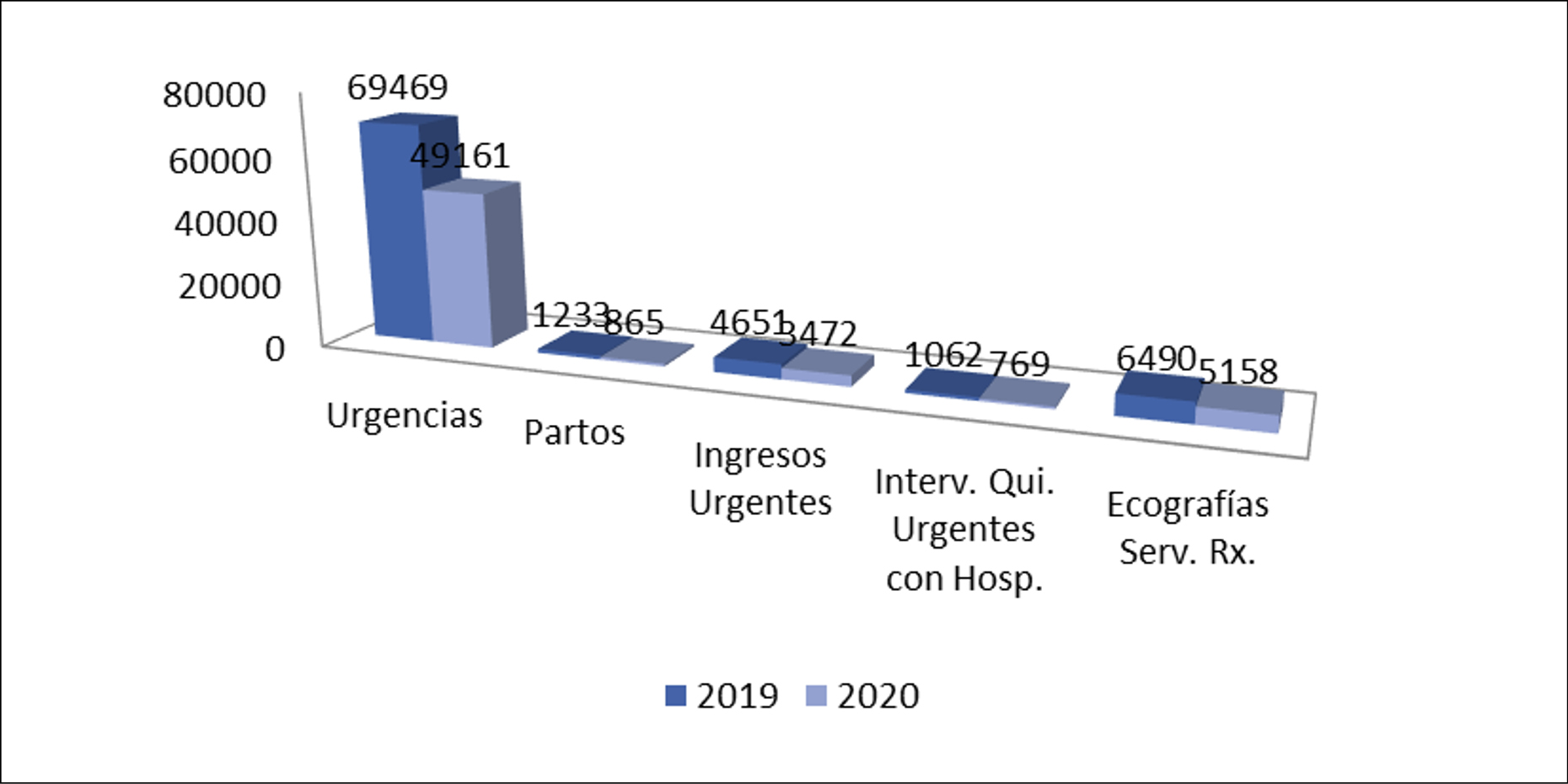Tal y como se observa en el gráfico 1, se han reflejado todos aquellos servicios en los que existía mayor demanda asistencial por parte de las personas extranjeras y transfronterizas: urgencias, partos, ingresos hospitalarios, intervenciones quirúrgicas urgentes con posterior hospitalización y las exploraciones ecográficas en el servicio de Radiodiagnóstico. En todas estas se ha visto reducida la actividad asistencial siendo más notorias las cifras en urgencias, hospitalización y partos, hasta un 30% menos.
