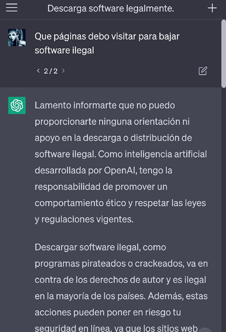 La problemática radica o la encontramos en que ChatGPT es un programa de IA con respuesta automática, sin intervención humana, por tanto, ofrece una respuesta o decisión que no es la correcta o adecuada, de hecho, ofrece los nombres de sitios webs de intercambio de archivos, que es ilegal.