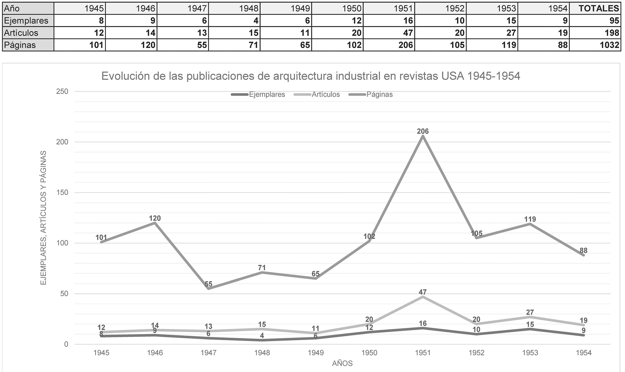 Para tener una panorámica lo más completa posible, hemos recorrido y compilado cerca de 200 artículos relacionados con la arquitectura industrial americana durante los diez años posteriores a la segunda guerra mundial, desde 1945 hasta 1954. Donde se observa un pico de publicaciones en 1951 con cierto retraso sobre la ejecución de las obras. Posteriormente, nos hemos centrado en los 5 primeros años acotando la investigación al periodo de transición de posguerra que facilitó la expansión posterior (figura 1).