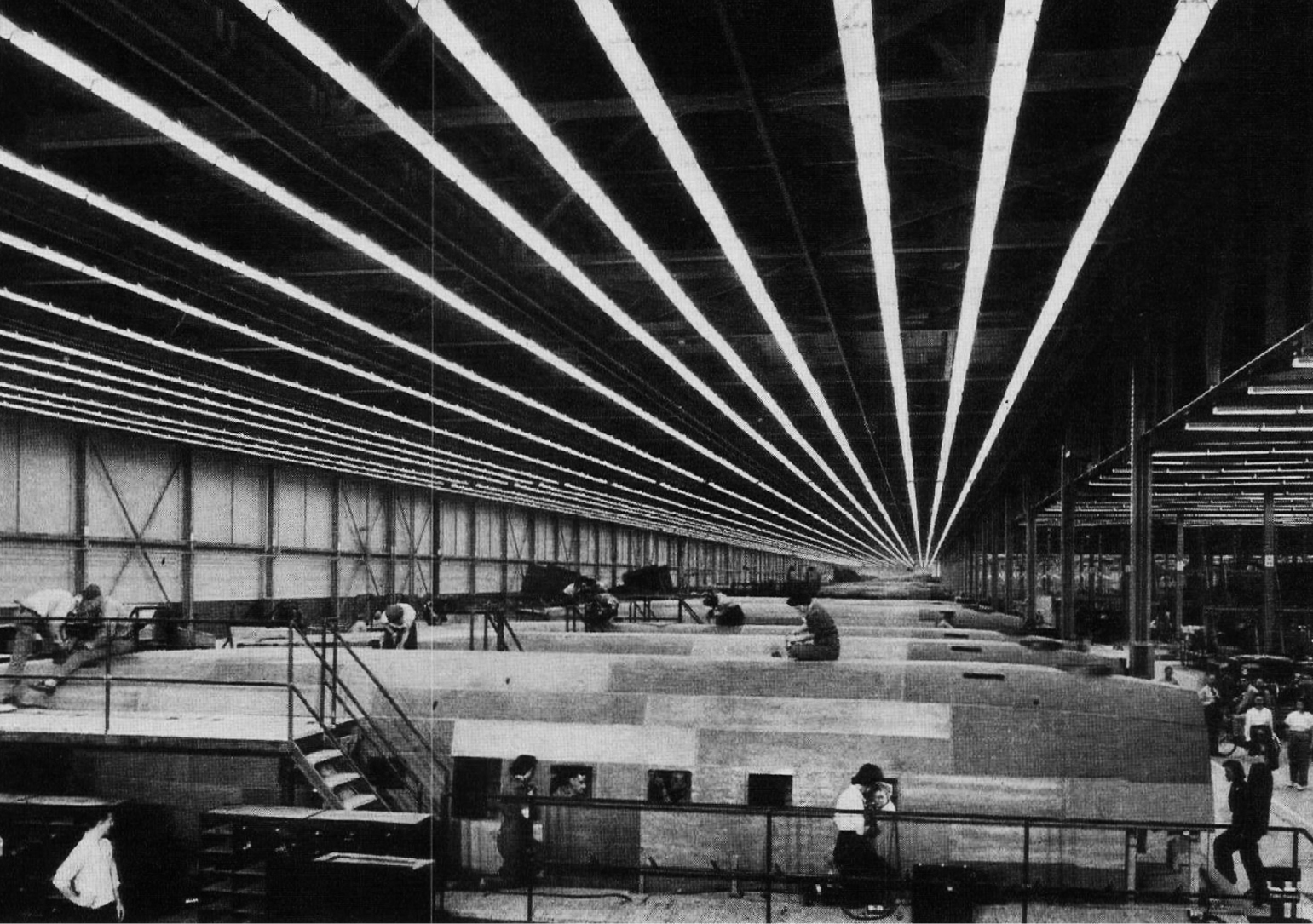 3. “Under continuous fluorescent lighting workers produce Douglas Skytrains in vast assembly área”. The Austin Company.