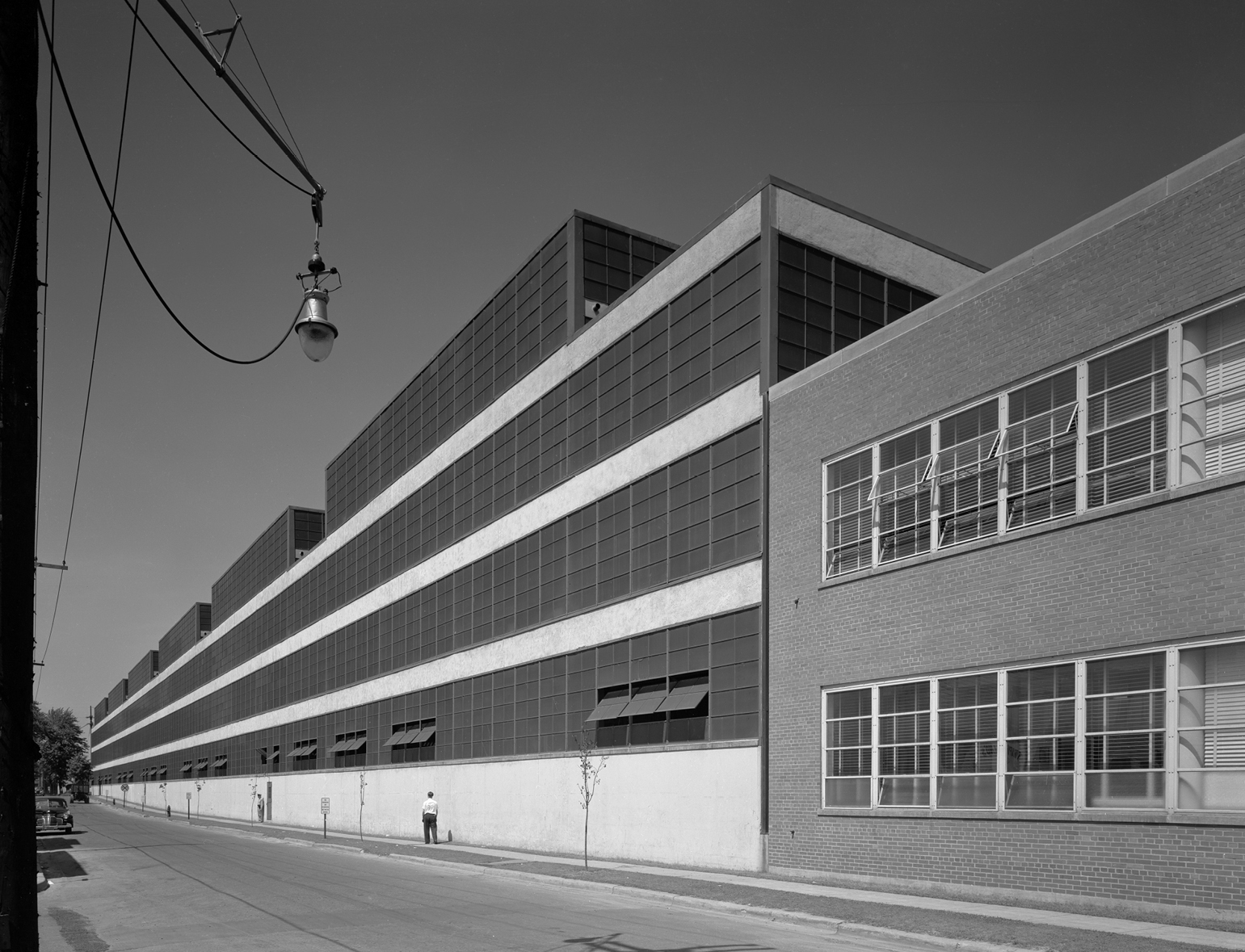 Muestra del peso social de la arquitectura industrial en esos años lo da el catálogo de la exposición del MoMA Built in USA: Post-War Architecture, donde se presentaban cuatro obras de carácter industrial entre las 43 escogidas. La selección se llevó a cabo por un comité de expertos independientes supervisados por Henry-Russell Hitchcock, conforme al método de “calidad y significancia del momento”[2]. Hitchcock apunta en la introducción que “comparativamente, las obras industriales se mantienen a un alto nivel y, sin embargo, como siempre, es difícil encontrar fábricas que destaquen especialmente”[3]. Comentario que va a refrendar unos años después: “La construcción industrial aún no ha sido aceptada en el ámbito de la arquitectura como lo ha sido la construcción comercial en los últimos cien años (…). Resulta difícil mencionar fábricas concretas, aunque solo sea porque su diseño, ya sea obra de ingenieros o de estudios de arquitectura especializados como Albert Kahn, Inc. ha llegado a una estandarización en gran medida anónima -el destino, por cierto, hacia el que algunos críticos consideran que se dirige inevitablemente toda la arquitectura del siglo XX-”[4]. Cabe resaltar que, de las cuatro obras industriales referenciadas, dos se corresponden con edificios de Mies y Wright, la Boiler plant en el IIT y la torre de investigación para la Johnson Wax Co. Otro de los ejemplos es el General Motors Technical Center de Saarinen, y que el mismo Hitchcock definió como “más comparable en escala y complejidad con una ciudad universitaria que con una factoría”[5]. El último ejemplo, la Bluebonnet Plant para el procesado de productos del maíz de Frank L. Whitney, es el único genuinamente industrial.