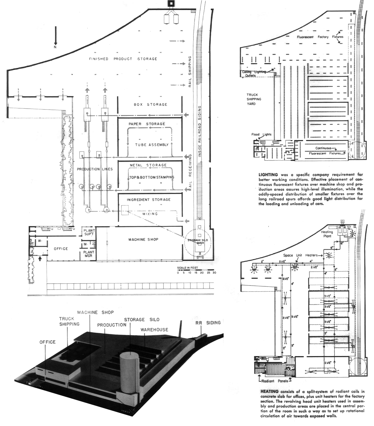 En agosto de 1947 The Architectural Forum publica la nueva factoría de forja y herramientas para la H.K. Porter Inc. diseñada por Walter F. Bogner[46]. La empresa, en pleno auge de pedidos de guerra, pidió al arquitecto que estudiara el coste de ampliación comparándolo a una nueva. Bogner diseño una planta completamente moderna con un coste inicial que duplicaba la ampliación, pero también ayudo a seleccionar el nuevo emplazamiento que reducía los gastos de explotación en un 10%. Tras numerosos estudios se llegó a una solución de la máxima eficiencia que integraba las dos factorías y que además facilitaba las futuras expansiones. Y en diciembre de ese mismo año, The Architectural Forum publicó una factoría de productos de limpieza para la B.T. Babbitt Co. en el distrito industrial Clearing de Chicago[47]. El arquitecto, Henry L. Blatner, convenció a la compañía de las ventajas de un esquema en una única planta con flujo ininterrumpido de materiales y carga interior. Además, para garantizar unas condiciones de trabajo saludables, se instaló un sistema especial de captación de polvo y sistemas de calefacción e iluminación (figura 9).