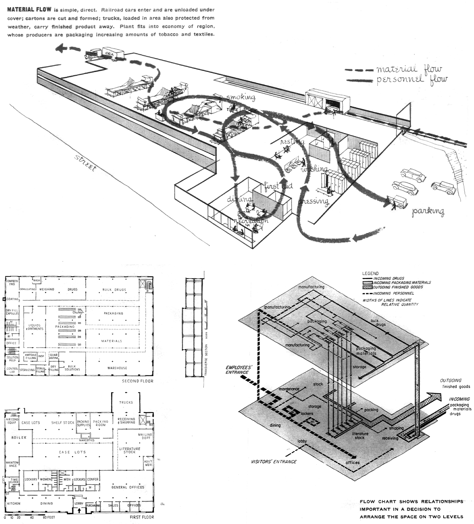 La misma revista incluía en su número de agosto de 1948 un artículo sobre nuevos edificios industriales[48]. El primero es una planta de plegado de cartón diseñada por The Ballinger Co. junto a Walter Gropius cuyo requisito fundamental era facilitar la producción continua y el trabajo de los supervisores, para lo cual ampliaron las luces habituales a un esquema de 50 × 20 pies en la zona de fabricación. El segundo edificio era un almacén diseñado para vender secciones de barras de acero pesadas “en el mostrador”; el único almacén completamente mecanizado de la industria siderúrgica del momento según sus ingenieros. Y la tercera obra presentada es una planta farmacéutica para los Abbot Lab. diseñada por Harper Richards y H.J. Doran. En este caso, el estudio se centraba en optimizar el funcionamiento y reducir los costes, para lo que se llegó a una solución en dos niveles donde las tareas de fabricación se agruparon teniendo en cuenta el movimiento periódico masivo de personal y materiales entre departamentos (figura 10).