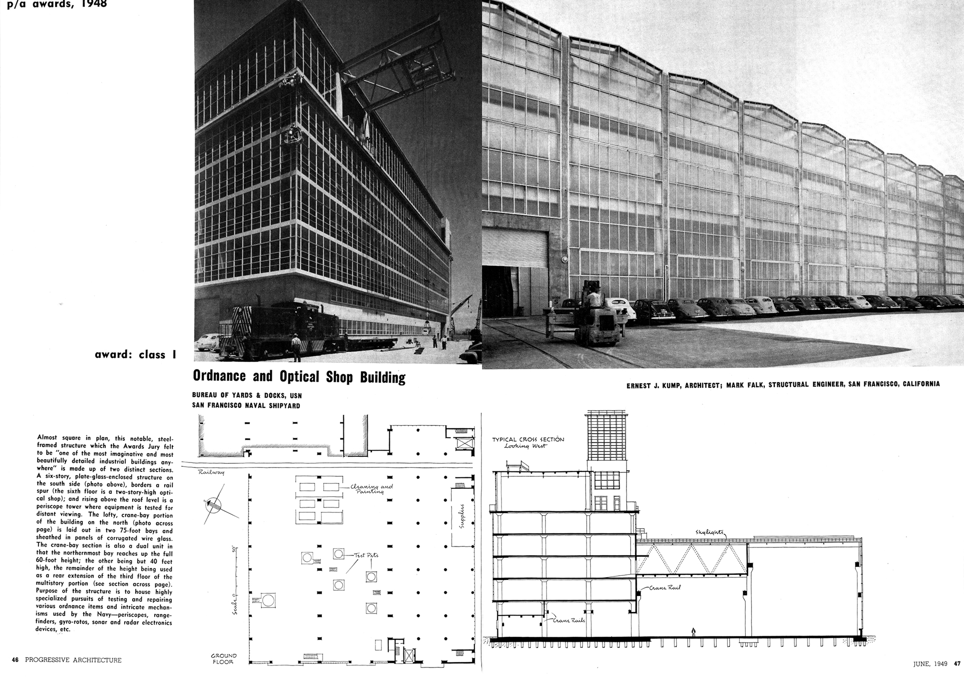 Los premios de arquitectura de la revista Progressive Architecture del año 1948 se dieron a conocer en el número de junio de 1949, y otorgaban en la categoría de edificaciones no residenciales el máximo galardón al edificio de artillería y óptica del Departamento de Marina de los EE.UU. en el Astillero Naval de San Francisco. El jurado valoró la obra del arquitecto Ernest J. Kump y el ingeniero estructural Mark Falk por ser uno de los edificios industriales más imaginativos y mejor diseñados del mundo: “El concepto, el tratamiento de los materiales y la iluminación están perfectamente integrados. Por su planteamiento tan directo, tan hábilmente realizado, el Jurado consideró que representa un progreso definitivo en la humanización de las plantas industriales”[50] (figura 12).