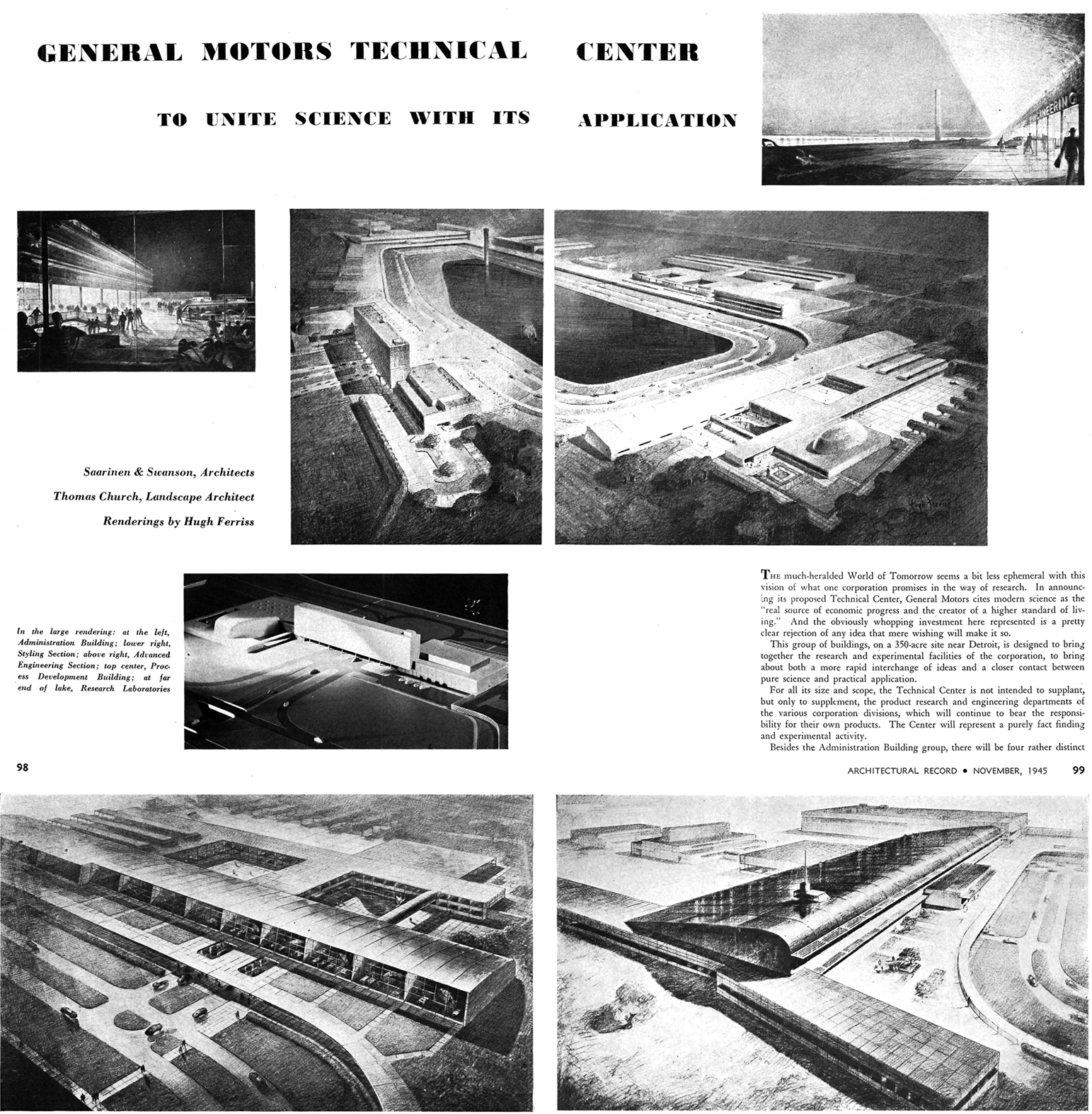 General Motors Technical Center to unite science with its application. En: Architectural Record [en línea]. Nueva York: F. W. Dodge Corp., noviembre 1945, vol. 98, n.º 5, pp. 98-103 [consulta: 30-09-2024]. Disponible en: https://www.architecturalrecord.com/ext/resources/archives/backissues/1945-11.pdf.
