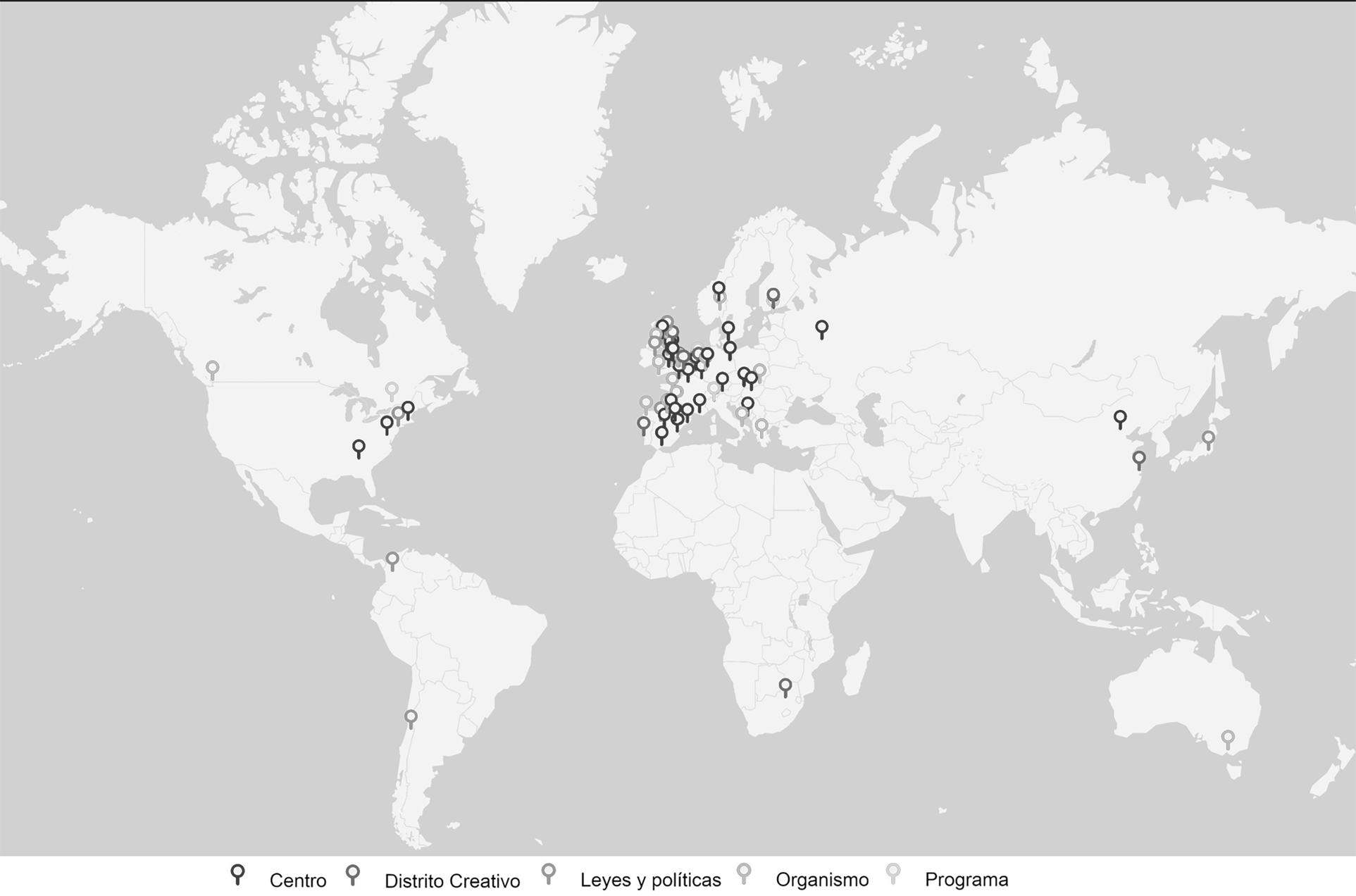Como se explica en la Introducción, los tres casos de estudio analizados forman parte de los resultados de la fase preliminar del proyecto de investigación CREAfab. Esta fase incluyó la creación de una base de datos espacial para mapear el fomento de las Industrias Creativas en relación con el patrimonio, distinguiendo entre dos niveles de análisis (Casos generales y Casos paradigmáticos), cinco categorías (Planificación, Organismos, Programas, Centros y Distritos Creativos) y dos ámbitos (Global y Nacional). Se registraron 142 casos en 26 países (figura 1), de los cuales se han seleccionado tres de la categoría de Centros para este análisis[39].