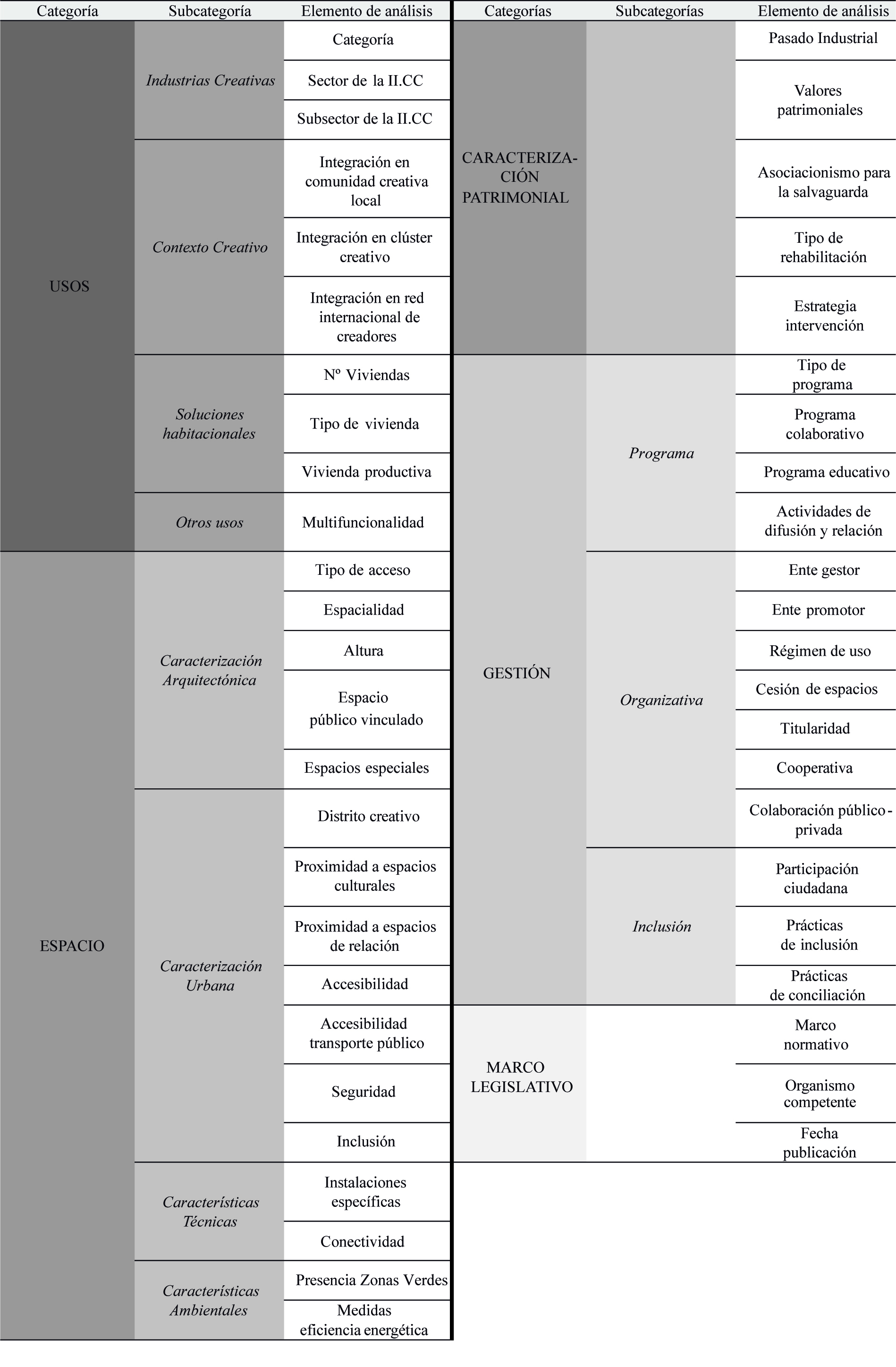 2. Esquema de los elementos analizados de los casos de estudio y sus categorías.