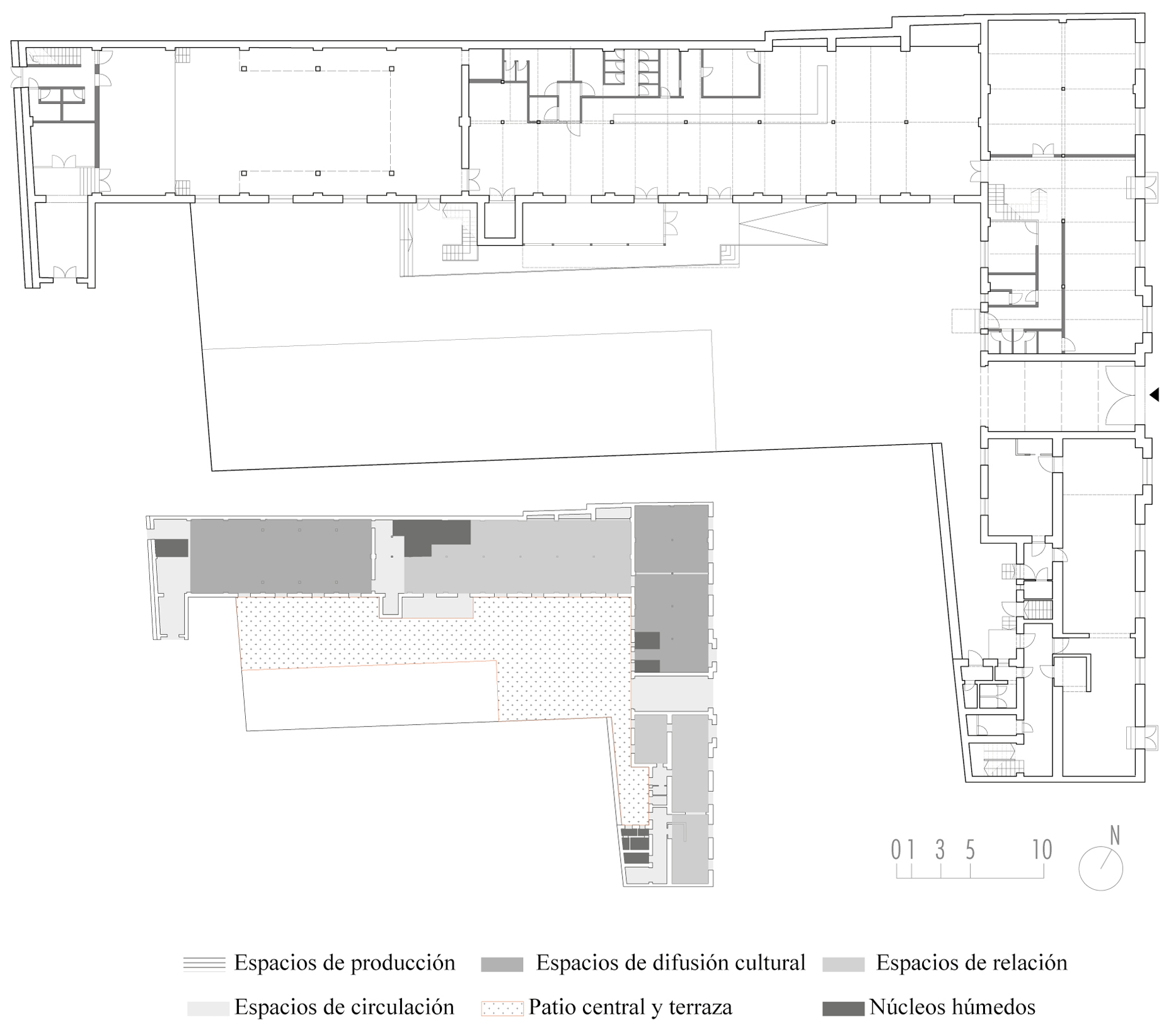 13. Planta baja y diagrama de usos del edificio B5, The Factory.
