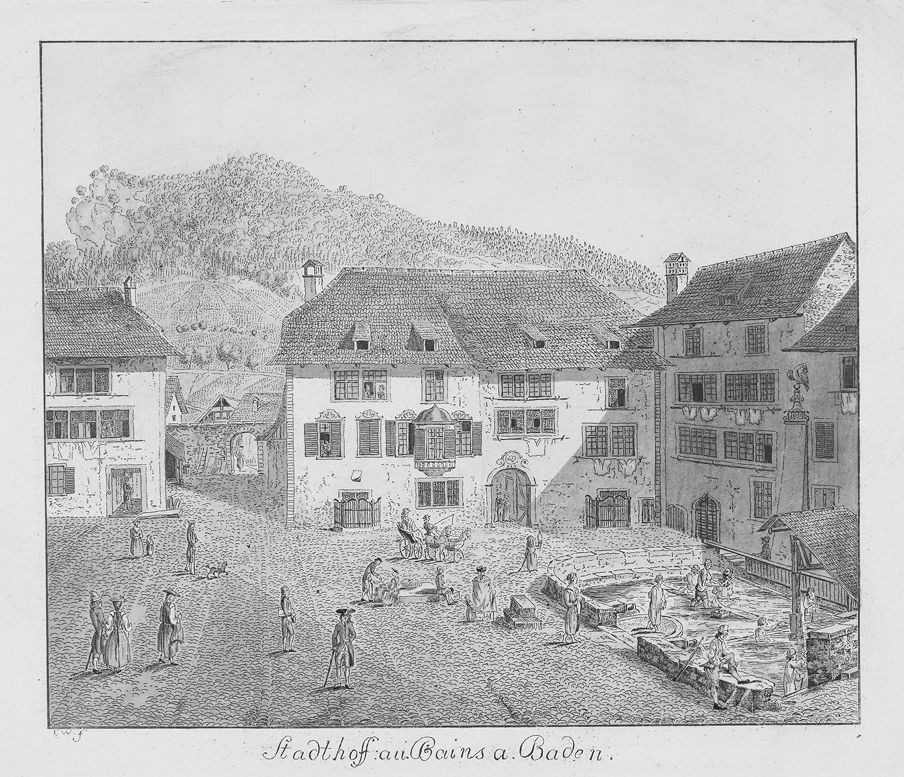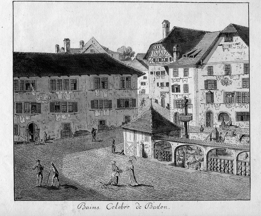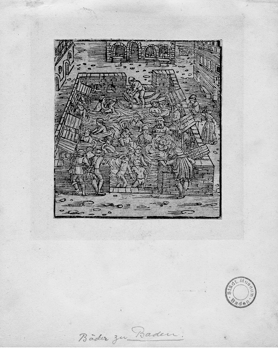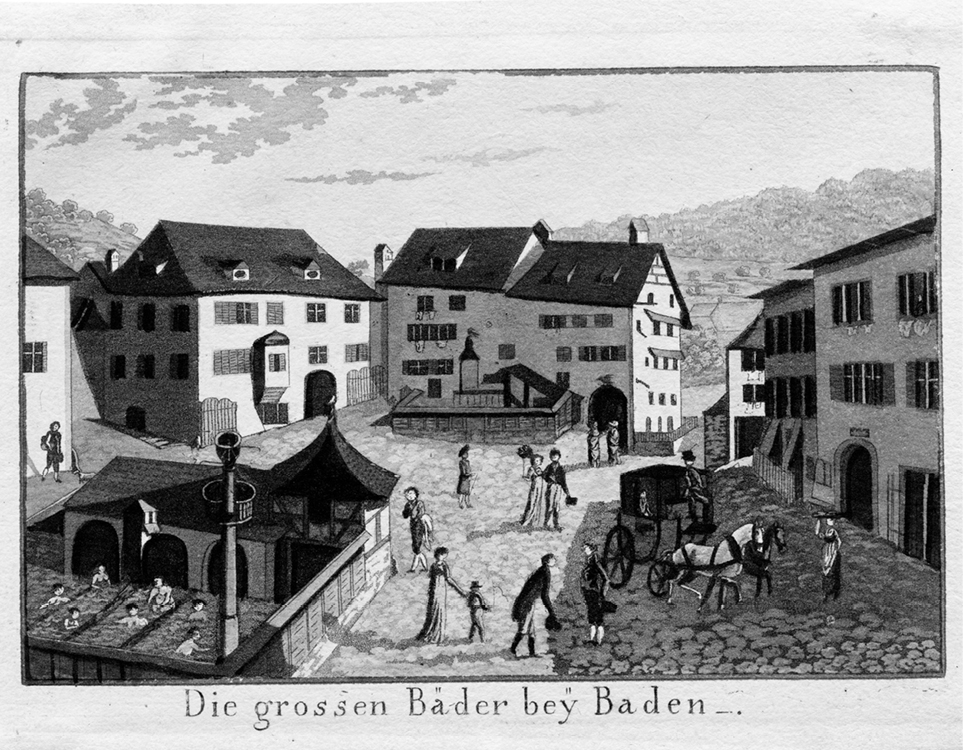 Baden, “bañarse” en alemán, es una ciudad suiza en el cantón de Argovia fuertemente vinculada a la tradición termal. Sus aguas medicinales[5], que brotan de 21 manantiales a 47 °C, ya se utilizaban en época romana[6], cuando la ciudad fue fundada como Aquae Helveticae y se construyeron las primeras termas. Recientes investigaciones arqueológicas dirigidas por Andrea Schaer (2024)[7], han precisado la ubicación de aquellas termas bajo la actual Kurplatz[8] en el Bäderquartier (Barrio de los Baños), donde hoy se concentran los manantiales termales y operan la mayoría de los hoteles. Pero lo interesante de Baden es que la tradición termal no desapareció con la caída del Imperio Romano, sino que ha evolucionado a lo largo de los siglos, manteniéndose hasta hoy. Más relevante aún es que esta tradición ha estado históricamente vinculada al espacio público y al uso colectivo del agua. Las termas romanas se transformaron en baños públicos al aire libre, consolidando el baño como una práctica situada en la plaza y no dentro de un edificio.