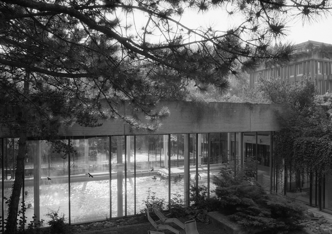 A pesar de la estructura de hormigón, el espacio era muy transparente porque las zonas no estructurales tenían grandes paneles de vidrio orientados al paisaje (figuras 6 y 7). Su textura se suavizaba con el uso de revestimientos de cerámica y piedra. Desde un punto de vista técnico, la piscina era una instalación extremadamente compleja y muy moderna. Incluía calefacción por suelo radiante, un sistema de ventilación que mezclaba aire fresco y aire caliente según la zona, una novedosa solución para evitar la condensación en las ventanas en invierno y sistemas eléctricos controlados. El agua provenía de varios manantiales y se almacenaba en un depósito central ubicado en la toma de agua del edificio. Desde allí, se distribuía a los baños Verenahof, Ochsen y al Thermalschwimmbad. Inicialmente, el agua emergía a una temperatura aproximada de 47 °C, pero era enfriada hasta alcanzar una temperatura adecuada para el baño, entre 35 y 36 °C. Durante las 12 horas de apertura diaria, el agua se renovaba y mantenía en circulación, vaciándose cada noche. La instalación podía acoger hasta 1000 visitantes al día. Pese a su funcionalidad y calidad espacial, el edificio fue finalmente demolido.