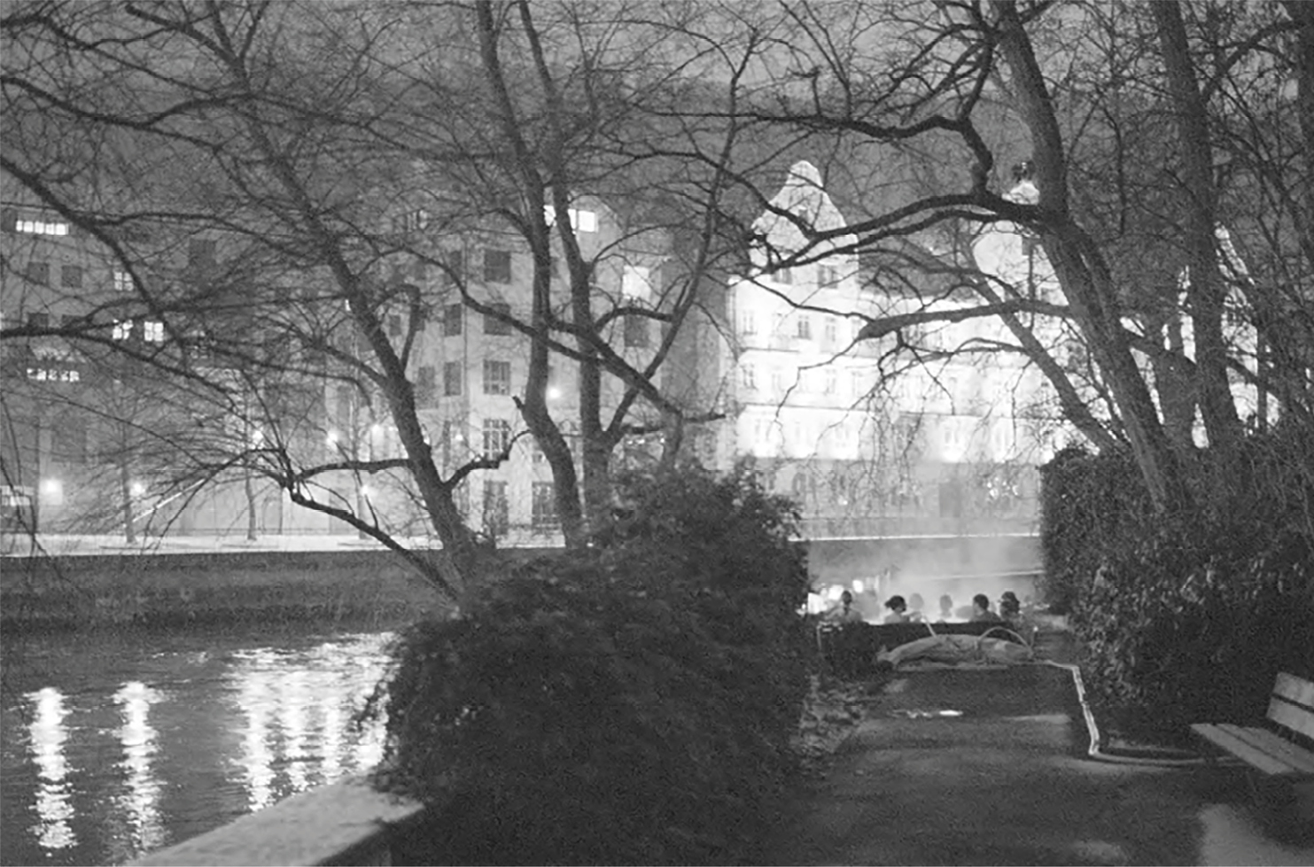 Los primeros eventos,llamados Plopp up Bädli, un juego de palabras con el término inglés pop-up y el sonido del agua al caer, consistía en construir piscinas efímeras, utilizando palés y láminas de plástico, llenadas con agua del manantial termal a través de tubos (figura 8). Al ser ilegales, se montaban y desmontaban en una sola noche, con ayuda de voluntarios. Según Marc Angst y Kathrin Doppler (entrevista, 2023), estos encuentros generaban espacios de cuidado, convivencia y cohesión social, donde se compartían tareas, comida, bebida y conversaciones sobre lo personal y lo político.