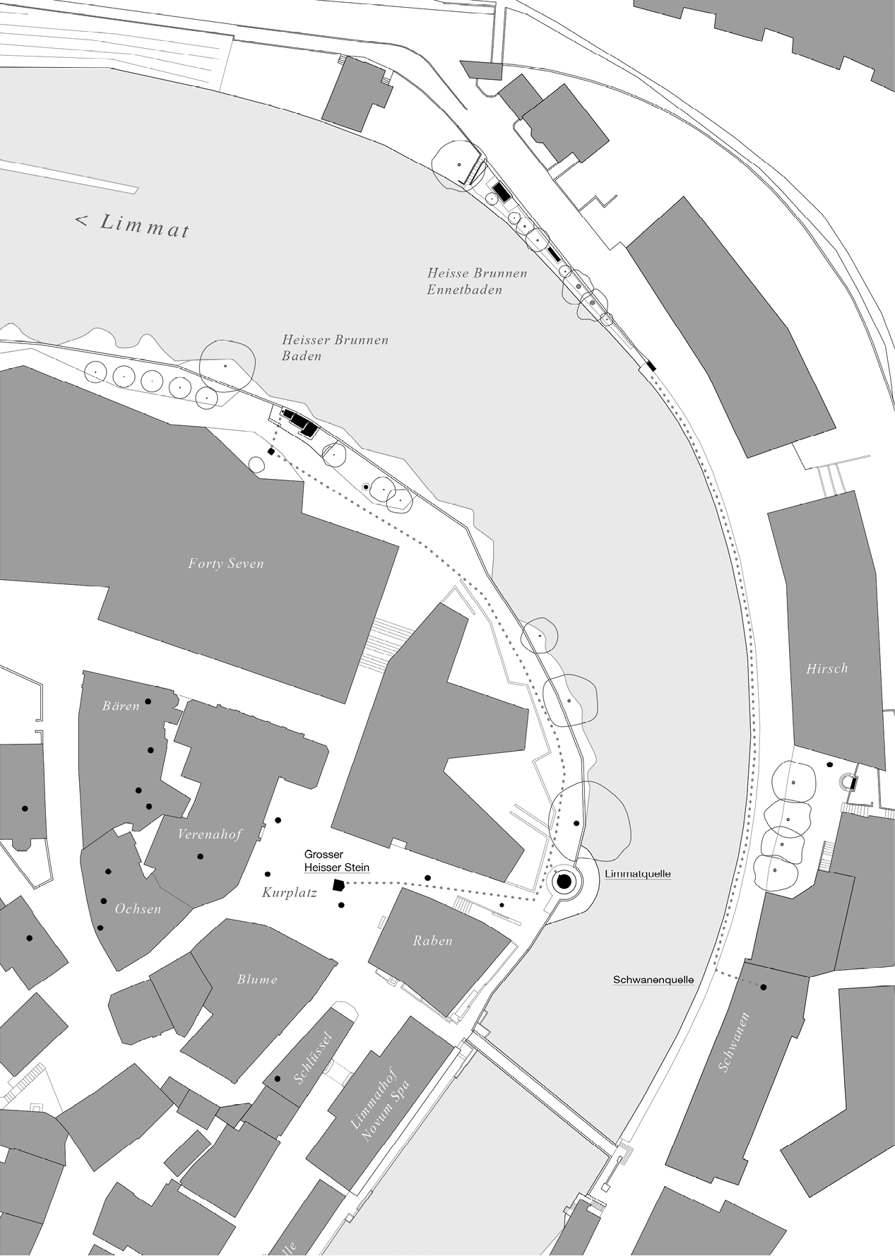 Pese a su aparente simplicidad, el proyecto refleja un profundo conocimientos sobre la situación de la propiedad del agua y la relación del cuerpo-espacio urbano. El tamaño y la forma de las piscinas están determinados por estos dos factores. Por un lado, las piscinas están situadas y diseñadas teniendo en cuenta las fuentes termales y los metros cúbicos de agua que pertenecen a los ciudadanos. Heisse Brunen, está interconectada con la compleja red de manantiales y su tamaño se basa en el volumen de agua común disponible.