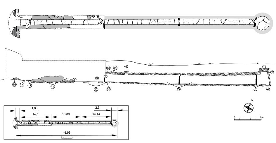 En el otro extremo del tramo inicial y próximo a la fachada (a 2 m) aún hoy se conservan dos pequeñas zanjas transversales abiertas sobre el subsuelo que fueron sacadas a la luz durante los trabajos de 1991/92 (Ruiz 2013: 212). Con algo más de 20 cm de anchura, parten del interior de cada uno de los muros laterales llegando a conectar la una con la otra, de modo que ocupan toda la anchura del corredor (fig. 16). La del sur daba cobijo a un gran ortostato vertical de cierre del pasillo que fue retirado durante los trabajos de 1963, y también este mismo destino parece que pudo tener la otra zanja, en este caso con el ortostato desaparecido. Ello derivaría en la existencia de un auténtico cierre del monumento, no en fachada sino un poco más hacia el interior y teniendo su trabazón interna con los muros laterales, lo cual significaría que fue diseñado para su colocación durante la fase final de la construcción del monumento y no como un elemento removible tipo “puerta” que se superpone y/o apoya, posibilitando sucesivas aperturas y cierres. El caso es que al estar encastrado en la propia obra de los muros, su retirada implicaría forzosamente una amplia rotura de la fábrica de mampuestos laterales, y esta circunstancia en modo alguno es apreciable en los muros. Aunque es esta nuestra mejor opción, analizando otras posibilidades tampoco es descartable que la zanja del norte, sin losa conservada, en vez de dar cobijo a una gran losa vertical que alcanzara a la techumbre, funcionara como un pequeño escalón como el que separa la cámara y corredor en el otro extremo del monumento.