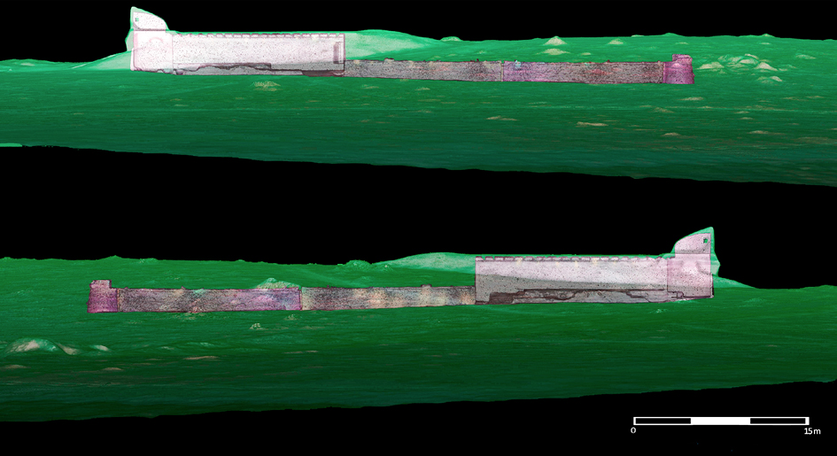 Figura 3. Planta y sección de La Pastora sobre la base de su escaneo (TLS) interior y exterior. En planta, las líneas claras son fracturas detectadas en las losas del suelo. En sección, localización de referencias arqueo-estratigráficas recogidas por las fuentes. Recuadro inferior con longitud general y por tramos de la construcción.