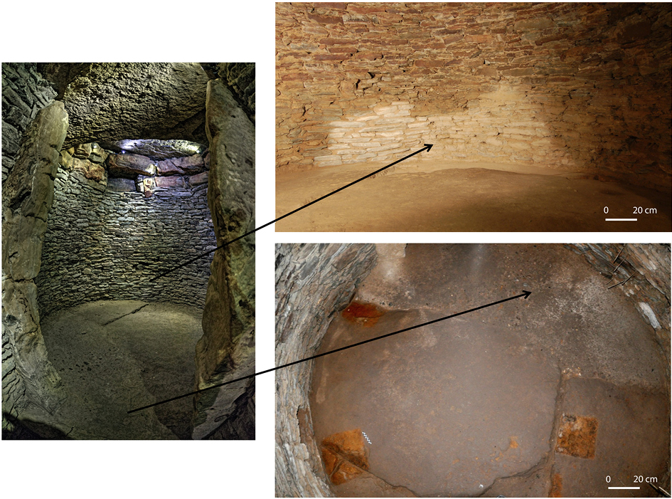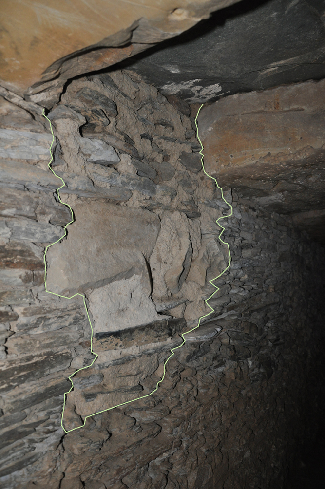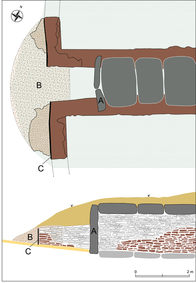 En todo el corredor la única interfaz detectada se ha documentado en la pared norte del tramo intermedio y hemos visto como se trata de una rotura producida desde la cubierta que alcanza a la fábrica original del muro originando un taponamiento posterior con un aparejo descuidado con presencia de bloques calizos no devastados y un mortero de cal y arena. La losa de la cubierta es sustituida por una diabasa que además no encaja en la posición original, sino que se sobrepone apoyando en las losas colindantes, y finalmente en el exterior coincide con una concentración de anomalías detectadas por la geomagnética que indican alteraciones del terreno. Todo ello, señales inequívocas de que se trata de un elemento asociado a un evento posterior al de la construcción original y que relacionamos con el lugar de descubrimiento y primitivo acceso al tholos, pues además su localización no es discordante con el dibujo original de su descubridor. La clausura de este acceso y por tanto de la obra de reparación se debió producir en una fecha anterior al relato de Cañal (1894) que ya recoge el cierre de esta primitiva entrada (Vargas et al. 2019) (fig. 10).