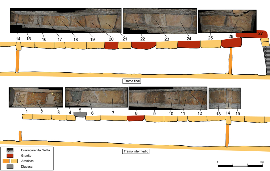 Y respecto a los paramentos, las perdidas alcanzan hasta la base del pavimento en la zona de contacto con el tramo intermedio, aquella en la que se practicaron profundas remociones y que primitivamente acogió la entrada al monumento antes del descubrimiento del tramo inicial. En el resto, las lagunas son menores y permiten definir una fábrica de mampostería con aparejo irregular de bloques de cuarzoarenita exfoliados, trapezoidales y mayoritariamente alargados dispuestos a tizón hacia el exterior y con cuñas de pequeñas lajas de nivelación que muestran una anchura de en torno a 75 cm. En su extremo occidental los muros se estrechan (55-60 cm) y se abocinan ligeramente hacia el exterior hasta enlazar con los correspondientes a la línea de fachada.