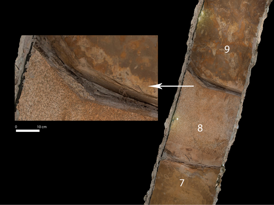 En otro orden de cosas, también podemos singularizar cómo dentro de las patologías constructivas, la presencia de abombamientos centrales en el pavimento o las fracturas transversales y oblicuas con continuidad entre bloques que hemos localizado en algunos monolitos de la cubierta, son la respuesta ante un notable esfuerzo estructural y una flexión excesiva de los materiales. En relación con ello, se trata de indicadores que encajan dentro de la tipología de estructuras de deformación que se ha establecido para la clasificación de los efectos arqueológicos de los terremotos (Rodríguez-Pascua et al. 2016: 156, fig. 3), por lo que no podemos descartar que estos daños identificados en la construcción fueran causados por los efectos de las sacudidas de un movimiento sísmico. Es esta una posibilidad que ya se ha apuntado para explicar el colapso de otros monumentos (Tejedor 2014: 82). La evidencia arqueológica de una fractura regularizada, de superficie lisa y con patina interior (losa nº 10) es indicativa de que la rotura no se ha producido en época reciente (fig. 6).