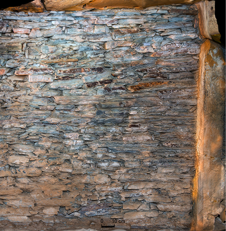 La primera supone la continuación, en quiebro, de los muros laterales del inicio del corredor con similar morfología y dimensionado. Se trata de un aparejo de mampuestos que conforman un muro de una anchura no superior a los 60 cm. Se trata de cuarzoarenitas exfoliadas, trapezoidales, mayoritariamente alargadas dispuestas a tizón hacia el exterior y con cuñas de pequeñas lajas de nivelación. Las hiladas son horizontales o tendentes a la horizontalidad con trabazón interior de los mampuestos y hacia el exterior, las caras planas y regulares, las caras internas aparecen desdibujadas y sin un frente regular. Se singulariza por conservar un acabado exterior que muestra un aplacado de losas verticales de cuarzoarenitas (fig. 12).