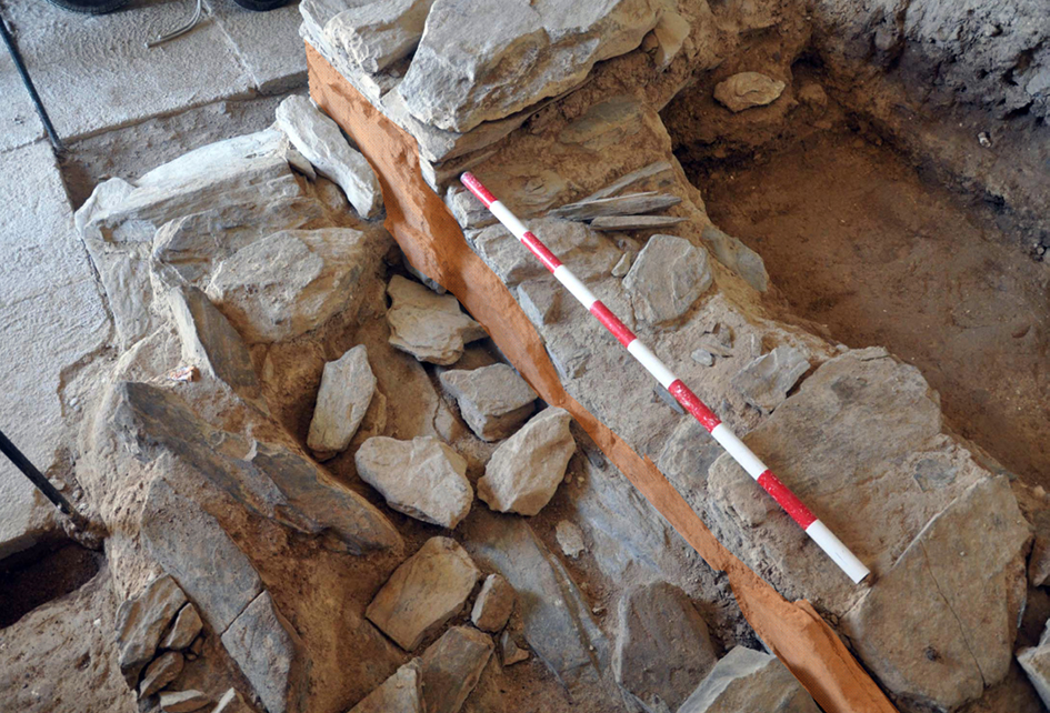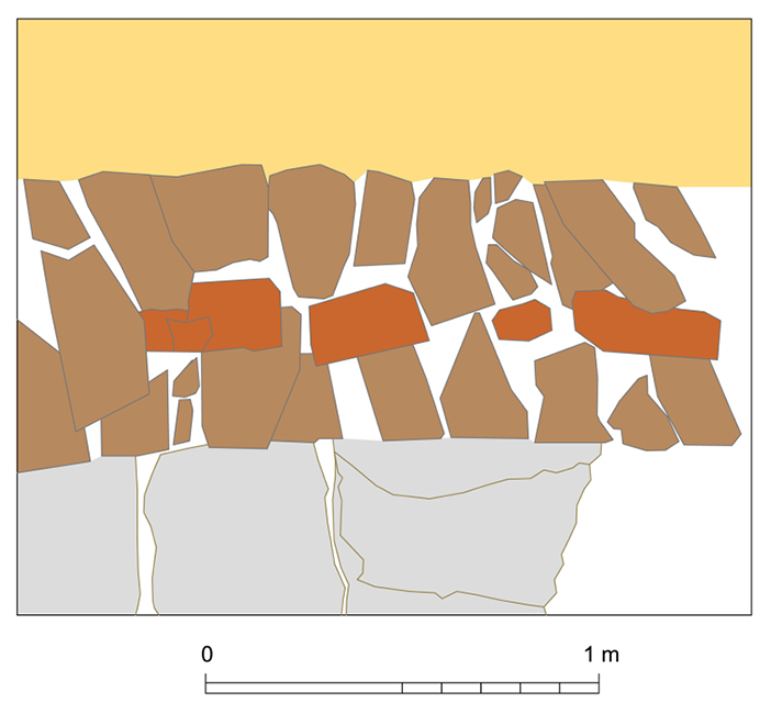 Figura 11. Detalle de la estructura interna de los muros de mampuestos entre el sustrato natural excavado (arriba) y las losas del suelo (abajo). Lado norte del tramo inicial del corredor.