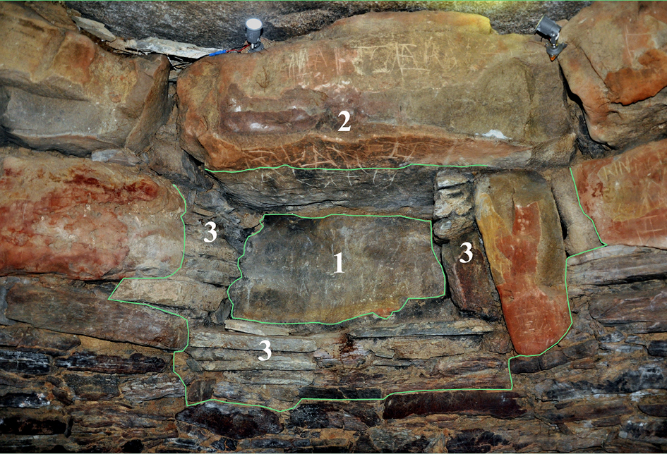 No creemos que pudiera pasar desapercibido para Tubino o Cañal que, en sus minuciosos relatos, nada señalan sobre su existencia, cuando por ejemplo en el caso de su descubridor se detiene en detalles tan particulares como la presencia de pequeñas conchas marinas en el suelo o entre los bloques superiores de la propia cámara, y nada cita de la existencia de la supuesta hornacina (Tubino 1868, Cañal 1894). El análisis estratigráfico apunta a elementos que difieren claramente de la uniformidad estructural del resto de la cámara, pues para formar el hueco de la llamada hornacina fue necesario realizar: el giro del bloque del fondo, ocultando la zona de tono rojizo que en el resto aparece como cara vista (fig. 13-1); con ello el bloque superior quedó descalzado por uno de sus lados y con una visible línea de separación entre el tono rojizo de la zona dispuesta para verse y aquella parte que originalmente estuvo oculta (tono gris), ello señala el lugar que debió ocupar el bloque original extraído (fig. 13-2); los laterales y la base se recubrieron con un aparejo diferente con recortes de lajas y mampuestos en vertical, en una disposición que únicamente se constata en este lugar (fig. 13-3); y finalmente la interfaz estratigráfica se señala además por la presencia como material aglutinante de todo este conjunto, de un mortero muy compacto de tono gris oscuro, en todo diferente de las arcillas depuradas marronáceas que hemos podido reconocer entre los intersticios de los mampuestos de la fábrica original (Vargas et al. 2019). Nos parece claro que con posterioridad a 1919 (Obermaier 1919: 33) se produjo esta intervención, probablemente con la intención de colocar alguna imagen que cristianizara el lugar, en un fenómeno que ha sido reconocido en diferentes lugares y es especialmente profuso en el Alentejo portugués (García Sanjuán 2008: 42).