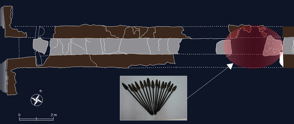 En el túmulo, junto a la nueva entrada artificial (la de su descubrimiento), en la pendiente occidental, debajo de una gran losa y en un recipiente cerámico se encontraron las 30 jabalinas. |
