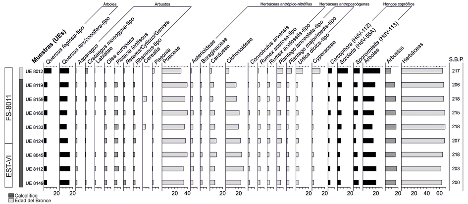 A diferencia de las anteriores, la muestra procedente de la UE 8012 del FS-8011, cronológicamente situada en un momento avanzado de la Edad del Bronce, ofrece un espectro polínico completamente diferente (fig. 13). En ella, las formaciones caducifolias de Quercus faginea muestran valores más elevados (12%), a la vez que se incrementan los porcentajes de pastizales húmedos de Cyperaceae (12.4%). Estos hechos, indudablemente, serían el reflejo de un momento climático más húmedo y posiblemente también menos térmico, toda vez que se reducen los valores porcentuales de los elementos termófilos antes señalados (Olea europea y Asparagus 0.9%, Pistacia lentiscus 1.4%). En esta muestra no hay constancia de polen de cereal. En cambio, las evidencias de presión pastoral son ahora mucho más evidentes y elevadas que en momentos calcolíticos: se incrementan notablemente los hongos coprófilos (Sordaria 16.1%, Sporormiella 9.7%, Cercophora 6%) así como las herbáceas antropozoógenas (Plantago lanceolata 9.7%, Plantago major/media 7.8%, Urtica dioica 10.6%).