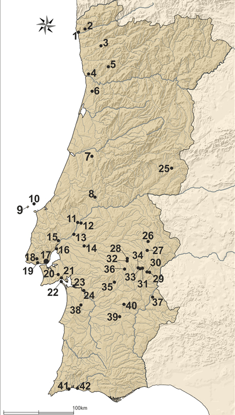 Figura 4. Difusión de las Lusitanas Antiguas en el território portugués: 1- Castro de Santa Luzia; 2- Castro da Terronha; 3-Braga; 4- Porto; 5- Lousada; 6- Castro de Fiães; 7- Conimbriga; 8- Tomar; 9- Berlengas; 10- Ao largo das Berlengas; 11- Santarém; 12- Alto dos Cacos; 13- Muge; 14- Coruche; 15- Monte dos Castelinhos; 16- Rio Tejo; 17- Lisboa; 18- Alto das Cabeças (Oeiras); 19- Freiria; 20- Chibanes; 21- Setúbal; 22- Tróia; 23- Abul; 24- Alcácer do Sal; 25- Idanha-a-Velha; 26- região de Monforte; 27- Castelo Velho de Veiros; 28- Soeiros; 29- S. Miguel da Mota; 30- Rocha da Mina; 31- Caladinho; 32- Santa Justa; 33- Monte do Almo; 34- Vidigueira (Serra d’Ossa); 35- Tourega; 36- Castelo dos Mouros; 37- Castelo da Lousa; 38- Cerrado do Castelo; 39- Monte da Cegonha; 40- S. Cucufate; 41- Monte Molião; 42- Foz do rio Arade.