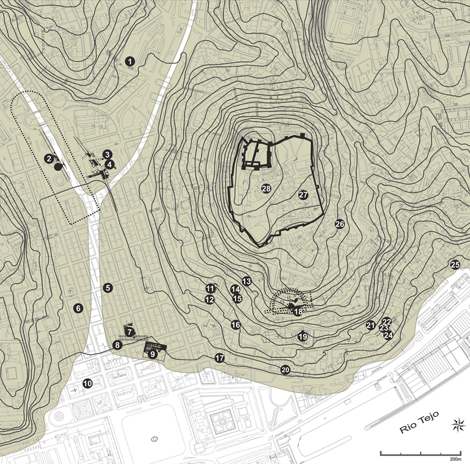 Figura 6. Procedencia de las Lusitanas Antiguas en la ciudad de Lisboa: 1- Encosta de Sant’Ana* (NMI 5); 2- Circo Romano* (NMI 2); 3- Praça da Figueira, 1961-1962 (NMI 4) (Almeida y Filipe 2013); 4- Praça da Figueira, 2000* (NMI 49); 5- Rua Augusta, 1988* (NMI 1); 6- Rua do Ouro, nº 133-145* (NMI 1); 7- NARQ (Dias el al. 2012); 8- Zara, Rua Augusta* (NMI 57); 9- Criptopórtico* (NMI 7); 10- Banco de Portugal* (NMI 9); 11- Termas dos Cássios, 1991* (NMI 11); 12- Termas dos Cássios, 2013 (NMI 3) (Gomes et al. 2017); 13- Escadinhas de S. Crispim* (NMI 2); 14- Palácio dos Condes de Penafiel* (NMI 26); 15- Calçada do Correio Velho* (NMI 1); 16- Largo de Santo António* (NMI 4); 17- Rua dos Bacalhoeiros* (NMI 12) (Filipe, 2008b); 18- Teatro Romano de Lisboa* (NMI 48) (Filipe 2008a; Filipe 2015); 19- Claustros de la Catedral* (NMI 16); 20- Casa dos Bicos* (NMI 4); 21- Beco do Marquês de Angeja* (NMI 1); 22- Rua de S. João da Praça, 2009* (NMI 1); 23- Rua de S. João da Praça, 2001* (NMI 5); 24- Palácio do Marquês de Angeja* (NMI 1); 25- Rua dos Remédios* (NMI 10), (Silva 2015; Silva et al. 2016); 26- Fundação Ricardo Espírito Santo e Silva (Silva, 2014); 27- Pátio José Pedreira* (NMI 1); 28- Rua do Espírito Santo* (NMI 1). *Filipe, 2019.