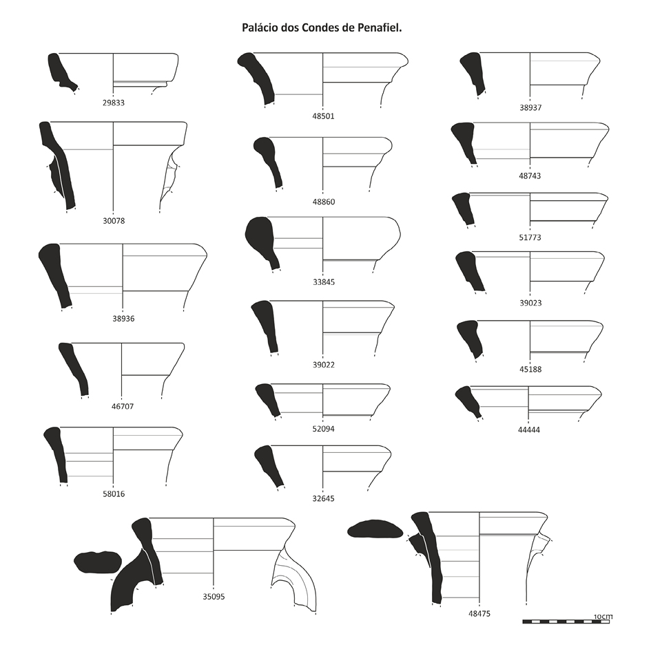 Del mismo modo, tanto en Lisboa como al parecer en el resto del territorio portugués, hay pocas variaciones del borde redondeado y engrosado en el exterior y liso en el interior, de las cuales solo se conocen dos ejemplares en Olisipo, en la Praça da Figueira (fig. 9, nº 9728.01) y en la Catedral (fig. 11, nº 11010) (Filipe 2019), cuyo mejor paralelo parece ser una pieza del Monte dos Castelinhos (Pimenta 2017: 201, fig. 6, nº 5). Esta variante tiene notables similitudes con el tipo VC de Apani (Palazzo 2013: 22) y, en menor medida, con la Ovoide 6 del valle del Guadalquivir (García Vargas et al. 2011), del que se diferencia principalmente por la apertura del cuello y el borde. Son dignas de mención las diversas variantes que se pueden encuadrar en las Dressel 7-11 y Haltern 70, lo que plantea la cuestión, ya mencionada, de un hipotético bajo nivel de estandarización.
