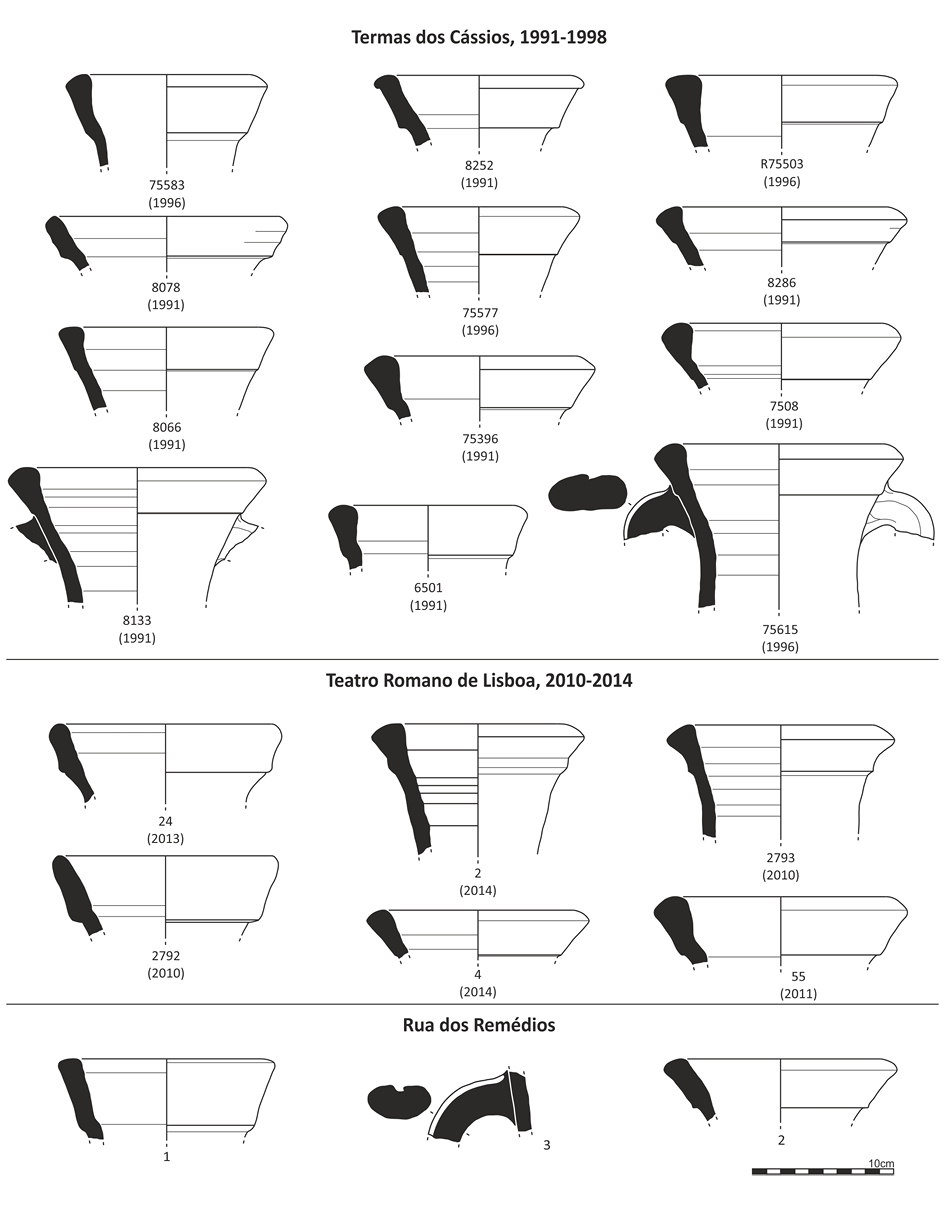 En cuanto a las variantes observadas en la muestra de Olisipo, compuestas en su mayoría por formas que encajan en el universo de las Dressel 7-11, Haltern 70 y Lusitana 12, parece significativa la escasez de bordes relacionados con la Ovoide 1/Clase 67, relativamente bien representados en el Monte dos Castelinhos (Pimenta 2015, Pimenta 2017), en el interior de Alentejo (Morais 2010, Mataloto et al. 2016) y en su Noroeste (Morais 2003, Morais y Fabião 2007). Igualmente escasos en Lisboa son los bordes de perfil subtriangular o subrectangular, observables en contextos republicanos tardíos en Pedrão (Mayet y Silva 2016: 63, fig. 6, nº 1-3) y en el interior del Alentejo (Morais 2010, Mataloto et al. 2016).