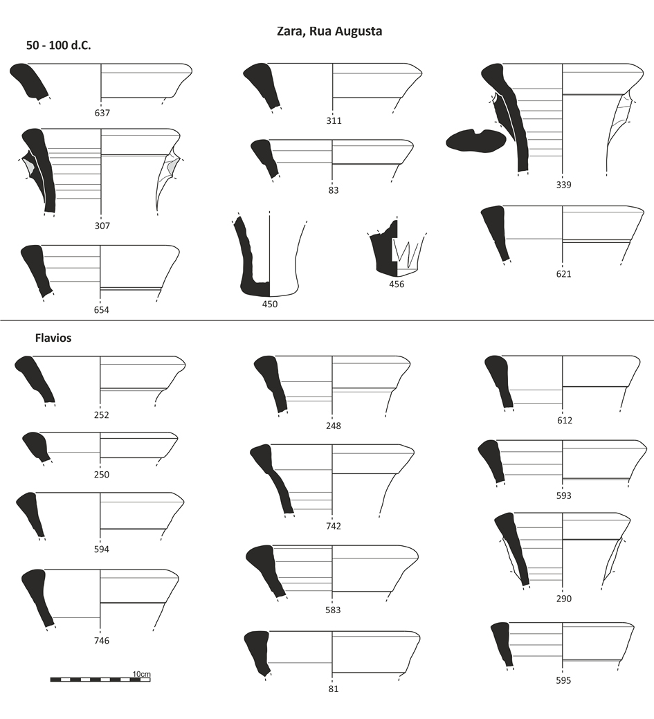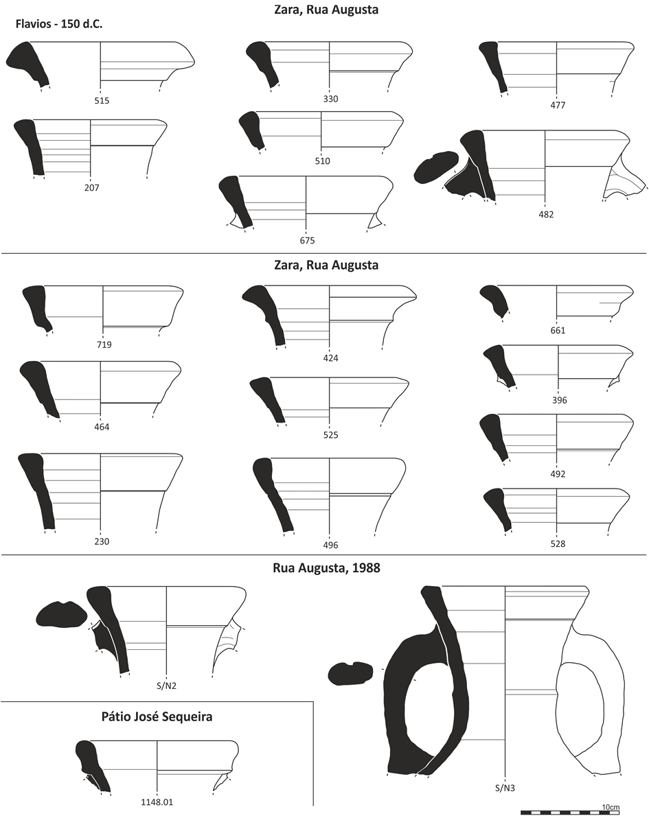 De igual modo, la proporción de Lusitanas Antiguas en relación con la Dressel 14 en los niveles flavios de Zara, Rua Augusta, representada en su mayor parte por piezas atribuibles a la Lusitana 12, parece ser significativa. Por otra parte, en la Rua de São Mamede, en contextos cronológicamente enmarcados entre el último cuarto del siglo I d.C. y el primer tercio del siglo II (Mota et al. 2017), no se registra la presencia de las Lusitanas Antiguas, mientras que la Dressel 14 está muy bien representada.