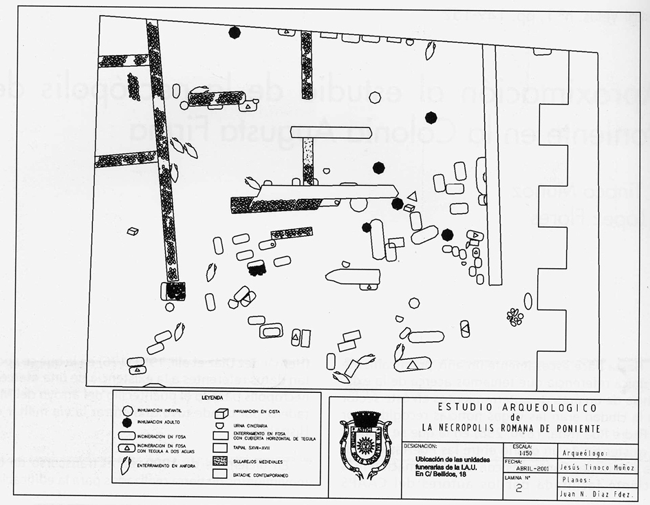 La excavación varios meses después de un solar próximo al anterior, situado en el número 18 de la calle Bellidos (fig. 1), puso al descubierto más de un centenar de enterramientos de incineración e inhumación pertenecientes a la misma necrópolis y fechados en el siglo I d.C. (Tinoco y López 2001). La participación en la intervención de un equipo de antropólogos físicos permitió un estudio en profundidad de los rituales de enterramiento, así como el análisis antropológico de los óseos, tanto desde el punto de vista demográfico como paleopatológico, cuyos resultados pueden extrapolarse a la población que vivió en Écija durante el siglo I de nuestra Era (López y Tinoco e.p.)[2].