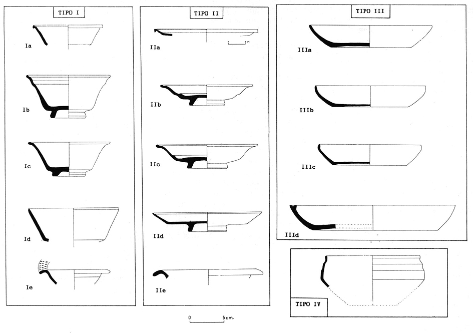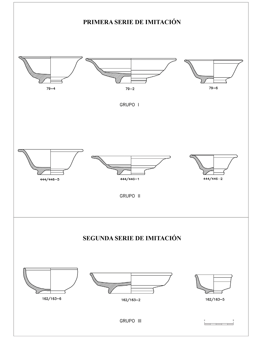 [10] Aunque se han vinculado a modelos itálicos distintos, las relaciones morfológicas entre el G-I y el G-II son evidentes, al igual que sus diferencias. La dificultad para discernir entre lo que puede ser una dependencia de ambos grupos a modelos itálicos diferentes, o una filiación directa entre un grupo respecto del otro, nos impide hipotetizar en estos momentos una evolución desde el G-I al G-II mediante la horizontalización del borde, la conservación de la depresión que delimitaba el labio al interior y, en el caso de los platos, un mayor engrosamiento del punto de unión entre el fondo y la pared interna para formar una arista.