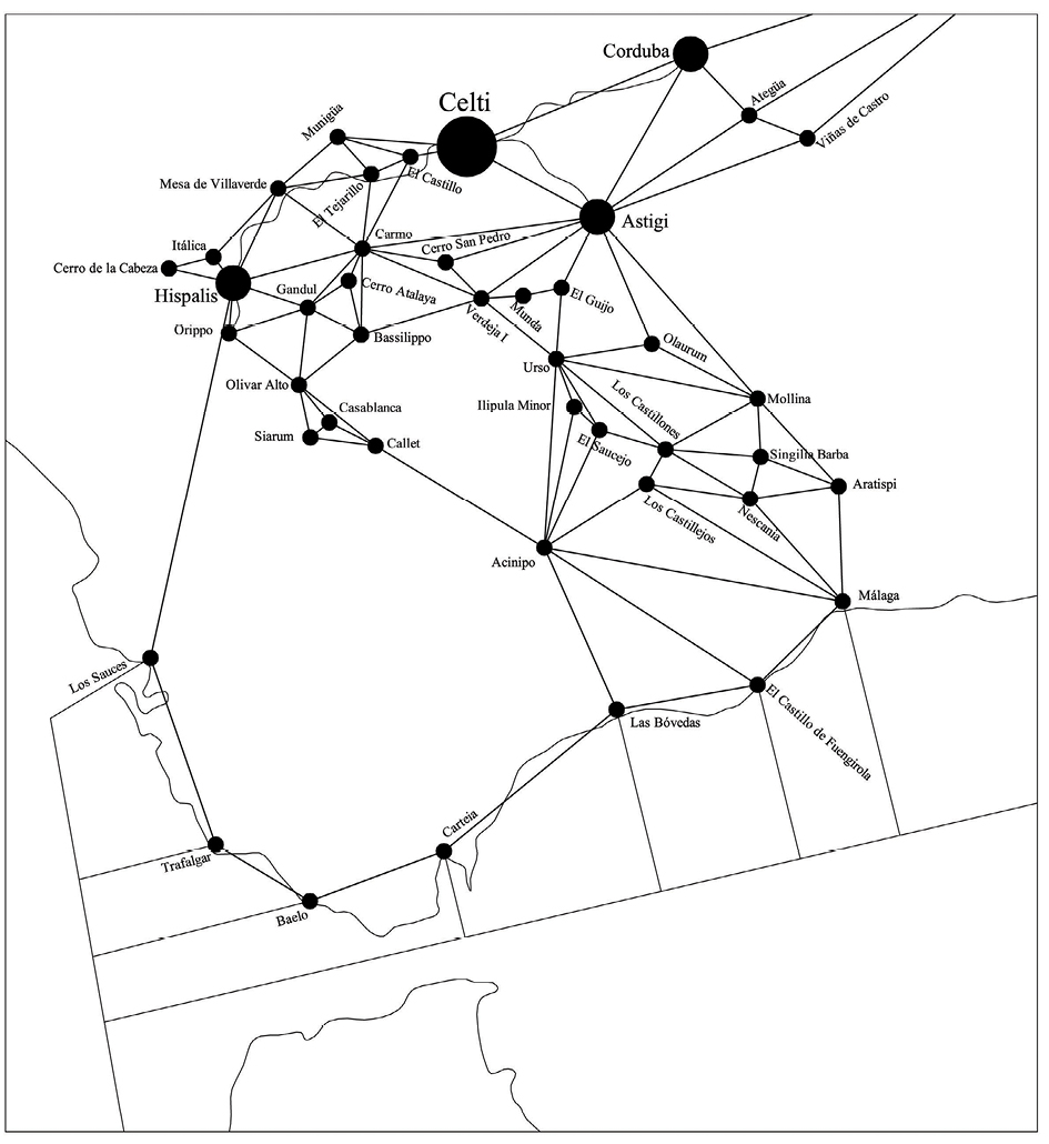 [6] Fue precisamente el corto radio de acción alcanzado por la distribución del Servicio “a” uno de los principales argumentos que apuntaban hacia Peñaflor como centro productor, junto con la existencia de piezas defectuosas o pasadas de cocción en el área artesanal de la antigua ciudad de Celti (Martínez 1989).