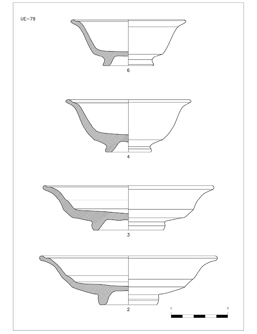 Tumba 79: Se documentaron tres servicios completos, compuestos por tres platos y tres copas de TS de imitación Tipo Peñaflor: