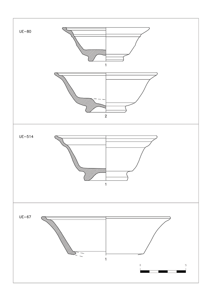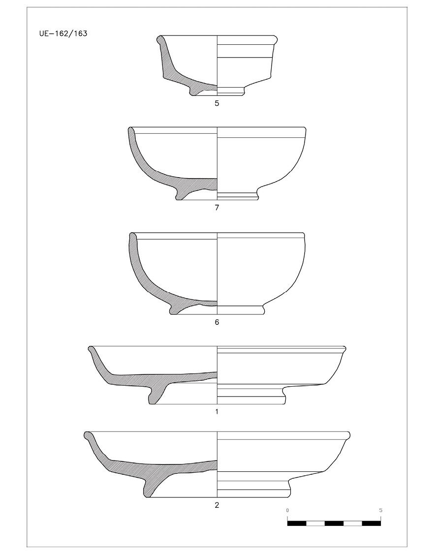 162-163.6 Copa/Cuenco: Imitación de la forma Ritt. 8 de amplia distribución en la Bética tanto en TS Sudgálica como Hispánica. Sus características formales lo aproximan tanto al modelo sudgálico (Bemont 1986) como al hispánico (Garabito 1978; Mezquiriz 1961) (Lám. V).