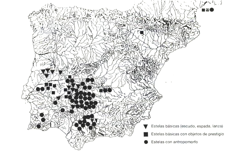 Debemos también señalar el problema de que la mayor parte de las estelas se encuentran ubicadas no en la zona nuclear tartésica –como parecería más lógico– sino en su hinterland inmediato. A esto sería conveniente añadir que en las estelas, hasta ahora consideradas más antiguas, la panoplia armamentística es bastante anterior a las fechas teóricas en que se las quiere situar, lo que como mínimo merecería un intento de explicación.
