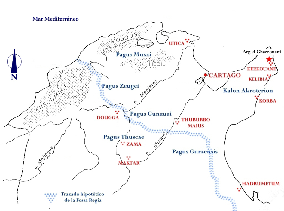 Figura 1. Mapa del área de Cartago con el trazado hipotético de la frontera númida (Fossa Regia) y las antiguas regiones púnicas (pagi)