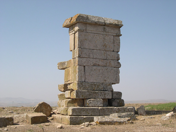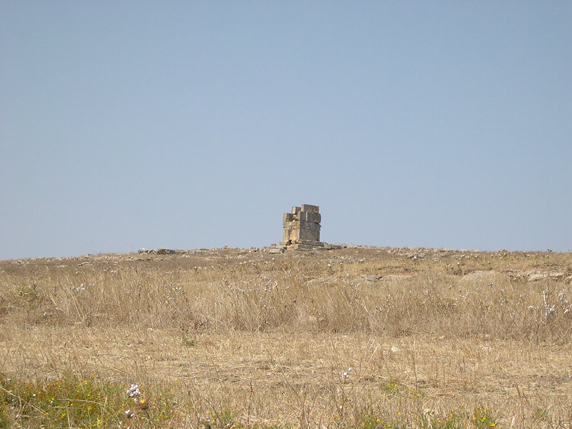 En las regiones montañosas de los Mogods, al noroeste del actual Túnez (ver de nuevo Fig. 1), junto a la frontera argelina y en la región de Hédil, caracterizada por unos relieves modestos jalonando los valles de los ríos Medjerda y Joumine, se construyeron numerosos monumentos turriformes púnicos, generalmente de carácter funerario, pero utilizados como marcas territoriales y de propiedad como muestra evidente de sus valores polisémicos. Estos monumentos (fig. 5) se alzaron como hitos en el paisaje, aislados, presidiendo amplios latifundios en los que escasamente se documentan testimonios materiales de la presencia púnica. En estas zonas apenas se han descubierto asentamientos y sí, por el contrario, abundantes necrópolis. Estas necrópolis, formadas tanto por tumbas tumulares como por los clásicos haouanet[14] son típicamente indígenas (líbicas). Parece, por lo tanto, que los indicios de la presencia púnica en estas zonas se limitan a la construcción de los monumentos. Estas construcciones monumentales, cargadas de simbolismo y ubicadas en lugares predominantes, aparecen controlando ideológicamente los territorios agrícolas de las zonas bajas. Así, a través del estudio espacial y de visibilidad, se ha podido observar cómo controlaban zonas demarcadas por pequeños cursos fluviales. Un buen ejemplo lo conforman los monumentos de Ksar Chenane y Ksar Rouhaha (ver figs. 5 y 6) con relación visual entre ellos y presidiendo dos zonas de explotación agraria separadas por un pequeño uadi. Todo apunta a que las grandes familias de corte aristocrático controlaban estas zonas agrícolas desde las ciudades, pero erigían grandes cipos arquitectónicos dedicados a los antepasados en lugares estratégicos como instrumentos de control. El tratado agronómico de Magón, que se dirigió, sin duda, al público culto dueño de estas fértiles propiedades, llama incluso la atención sobre estos aspectos al recomendar que los terratenientes deberían habitar en el campo para controlar directamente la producción. A partir de Magón sabemos que la mano de obra agrícola estaba compuesta mayoritariamente por esclavos y por prisioneros de guerra, lo que trajo consigo numerosas revueltas serviles y una sensación constante de inestabilidad en los alrededores de Cartago (Cecchini 1986:109).
