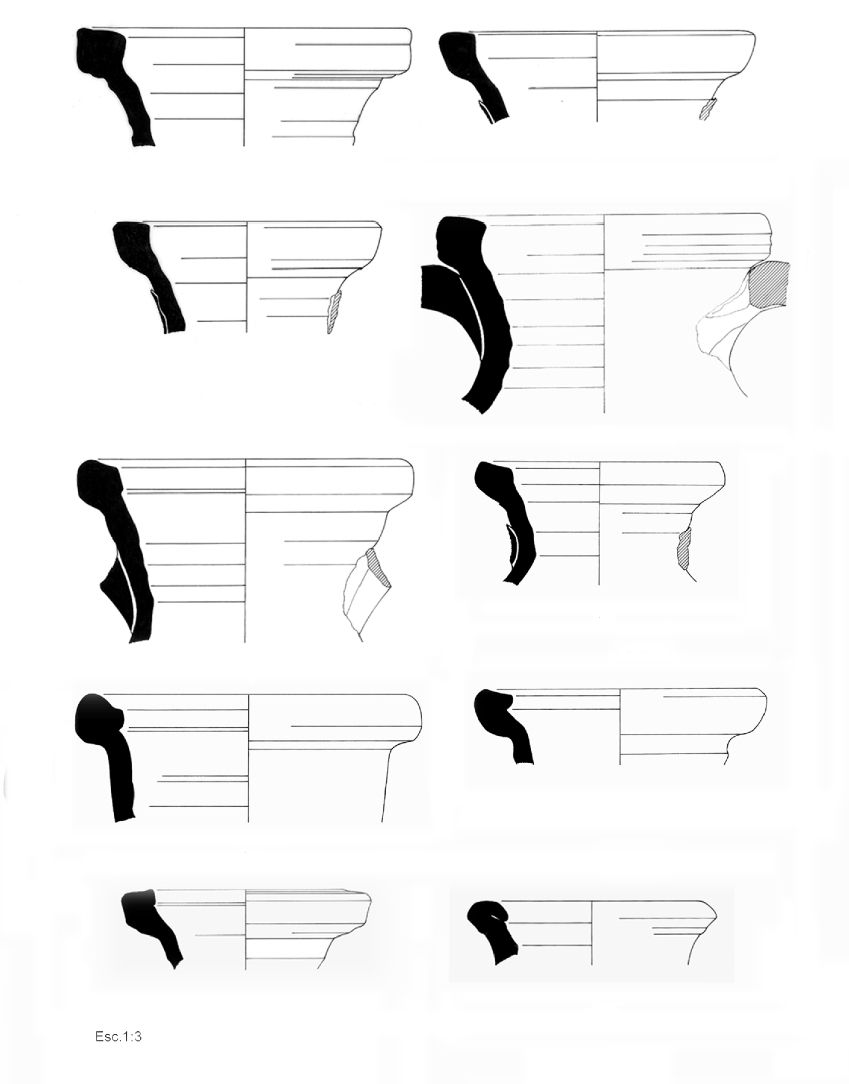 Com excepção da variante de bordo com a parede externa moldurada (tipo urceus 2), os exemplares do naufrágio Sud-Perduto 2, encontram paralelo em fragmentos por nós já apresentados. A variante tipo de bordo simples (tipo urceus 3), é semelhante a um fragmento de bordo recolhido em Braga na Zona das Cavalariças (fig. 3, nº 1); a variante mais comum, com bordo saliente e espessado (tipo urceus 1), está presente em todas as estações arqueológicas estudadas, admitindo inclusivamente, como já referimos, dois módulos distintos (fig. 4 a 6, nº 2-36).