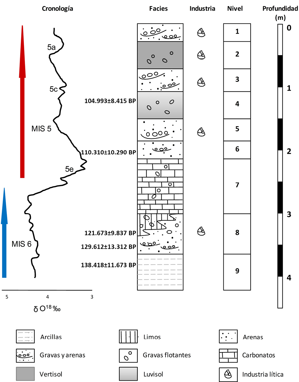Figura 2. Síntesis de los perfiles estratigráficos del yacimiento, con indicación de litofacies, niveles, localización de la industria lítica y su correlación con los estadios isotópicos. Modificada (Caro et al. 2011). ^