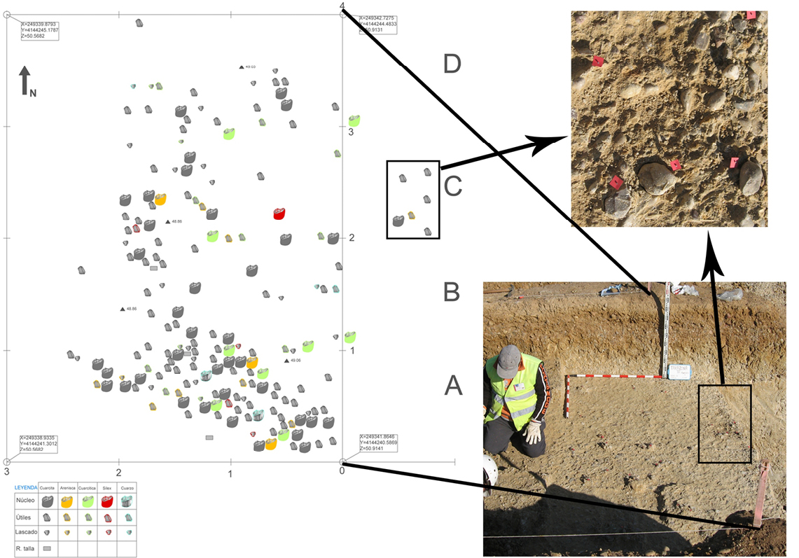 El material arqueológico que se analiza en este artículo procede de una actividad arqueológica de urgencia llevada a cabo en 2008, como consecuencia de las labores de extracción de áridos para la construcción de una autovía. Durante dicha actividad, primero se realizó una prospección de la zona de cautela previamente delimitada, analizando todos los perfiles estratigráficos. Posteriormente, en el lugar donde los depósitos fluviales presentaban una mayor concentración de industrias líticas, se procedió a excavar un área de unos 16 m2, profundizando hasta los 1.8 m. Metodológicamente se actuó realizando tallas manuales de 10 cm hasta el agotamiento de los niveles fértiles. Todo ello fue fotografiado y documentado con dibujos topográficos, plantas y alzados. La naturaleza de urgencia de los trabajos solo permitió coordenar parte de los restos líticos del nivel 5, que junto a la recogida de información topográfica del entorno y georreferenciación de las cuadrículas de excavación (López-Fraile et al., 2014), al menos, han servido para realizar un estudio orientativo de la distribución espacial en este depósito. Además de dibujar los cortes estratigráficos de la excavación, también se documentó de forma gráfica la estratigrafía completa del perímetro delimitado del yacimiento (Caro et al., 2011).