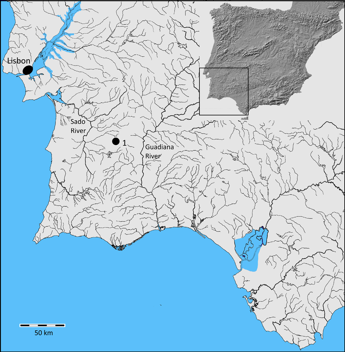 Figure 1. Location of Herdade do Álamo site in the Iberian Southwest (Map represented with the 3rd millennium coastline). ^