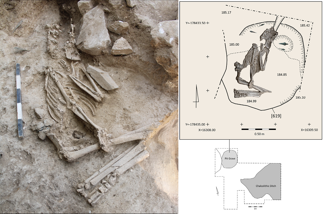 The individual in the pit grave corresponds to a primary deposition orientated North – South (20º-200º), in foetal position and with the skull turned to the left side (East). The left upper limb was flexed over the chest and the right was extended along the chest, with the hand over the right femur. The lower limbs were flexed to the left.